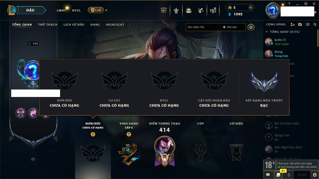 Rank Đơn: Bạc IVKhung: BạcTướng: 172 - Còn 26083 THXTrang Phục: 177Rank ĐTCL: Đồng IIILinh Thú: 33