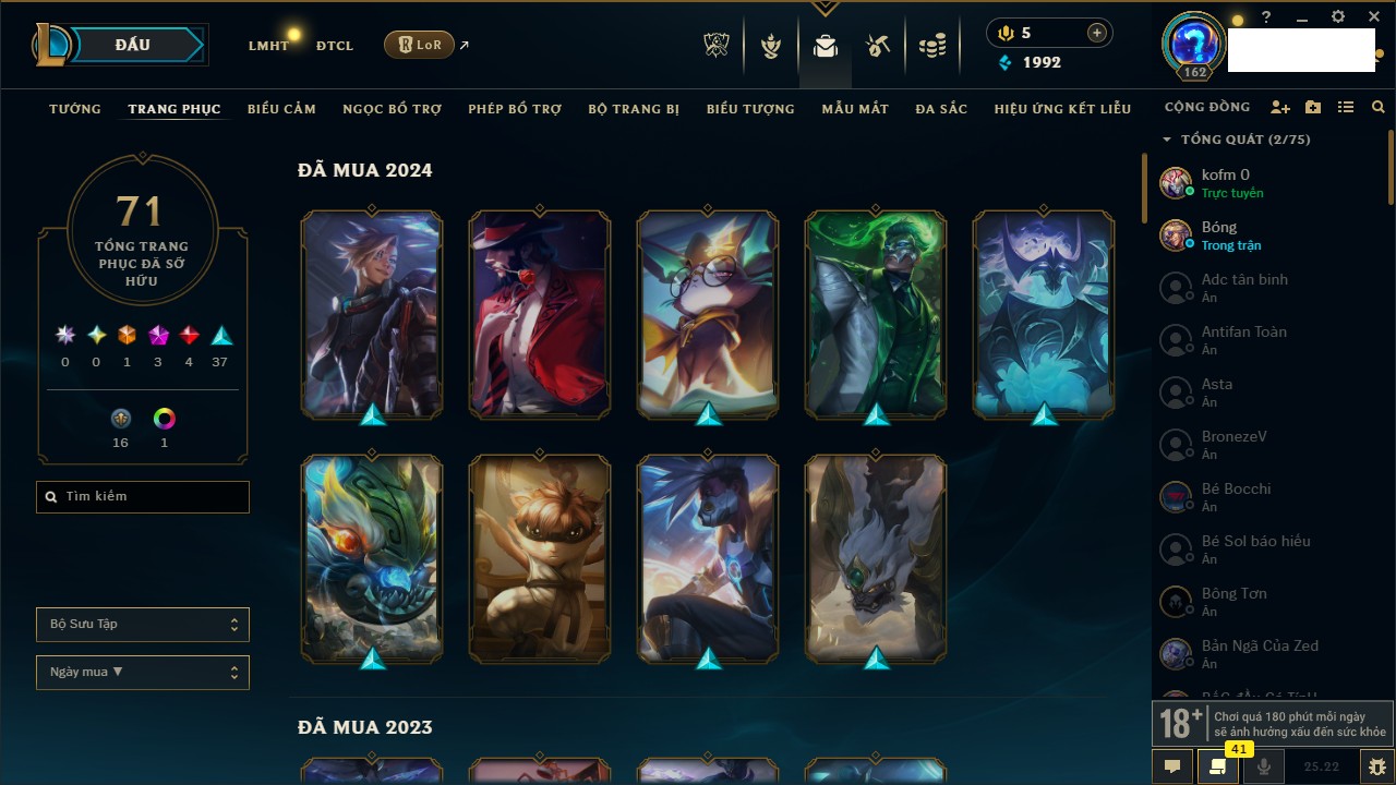 Rank Đơn: Chưa RankKhung: Chưa có khungTướng: 127 - Còn 1992 THXTrang Phục: 71Rank ĐTCL: Chưa RankLinh Thú: 105