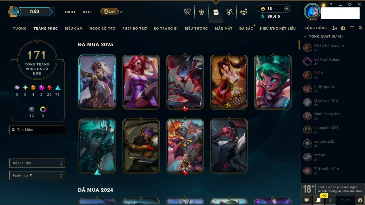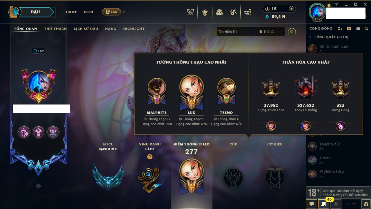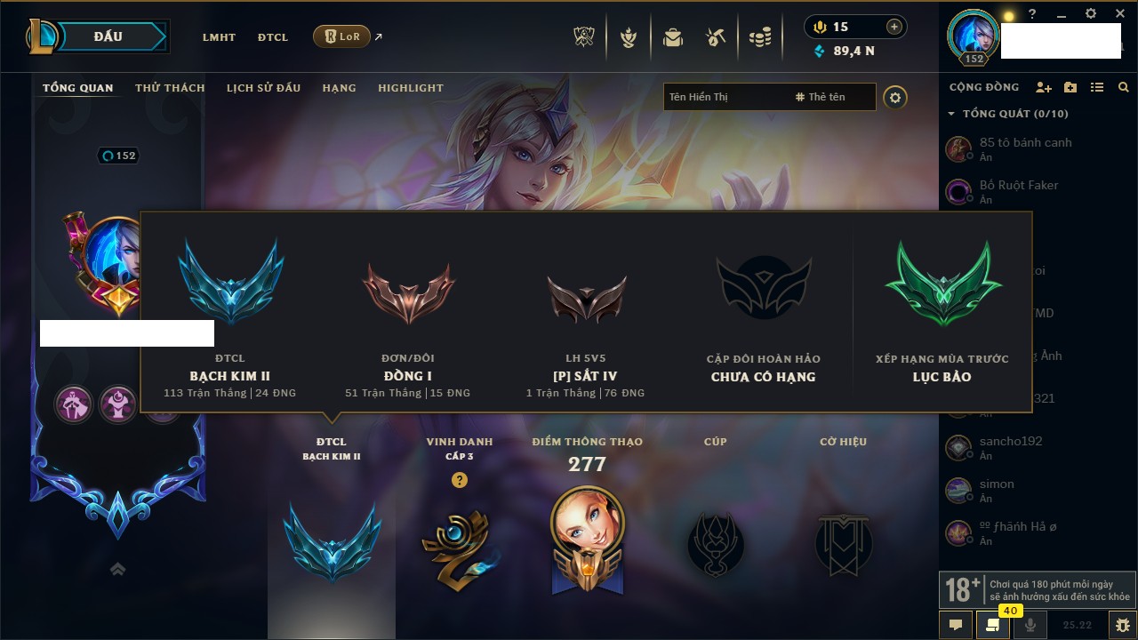 Rank Đơn: Bạch Kim III Khung: Bạch kim Tướng: 171 - Còn 79166 THX Trang Phục: 441 Rank ĐTCL: Bạc IV Linh Thú: 354