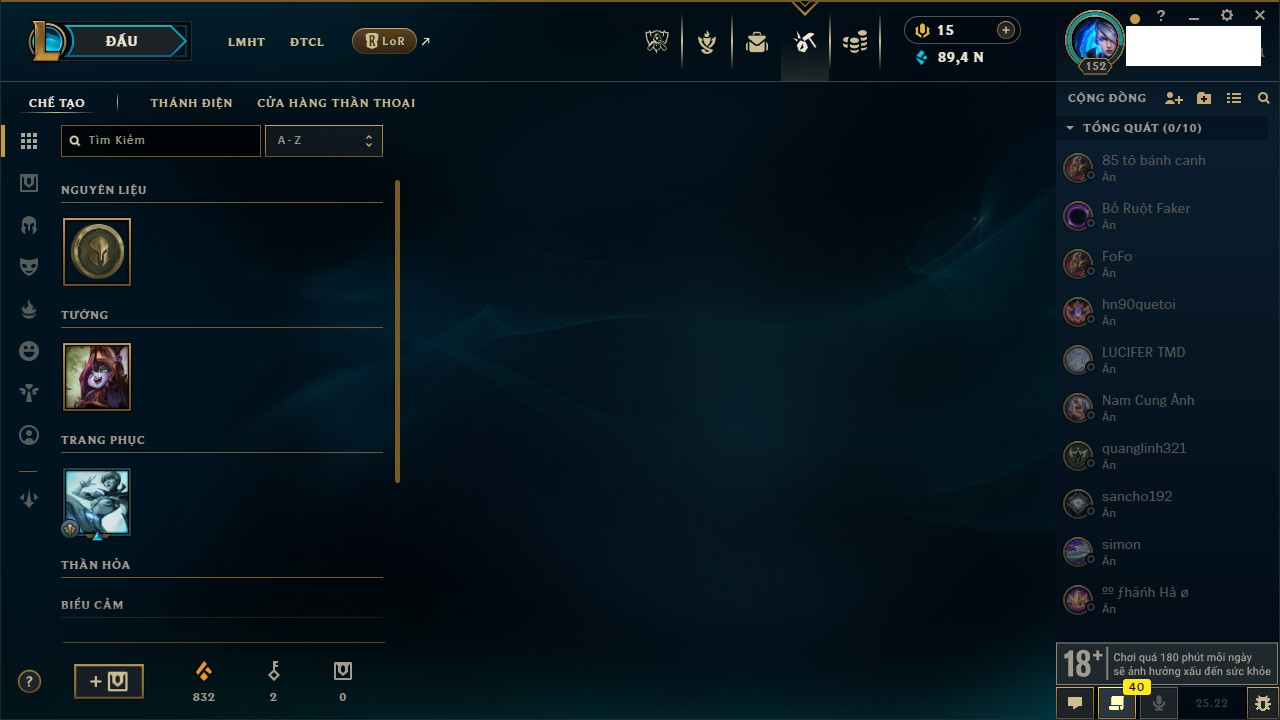 Rank Đơn: Chưa Rank Khung: Chưa có khung Tướng: 169 - Còn 15524 THX Trang Phục: 175 Rank ĐTCL: Bạc I Linh Thú: 389