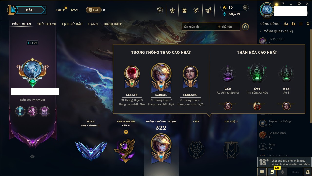 Rank Đơn: Chưa rank mùa nào Khung: Chưa có khung Tướng: 3 - Còn 9500 THX Trang Phục: 0 Rank ĐTCL: Bạch Kim IV Linh Thú: 21