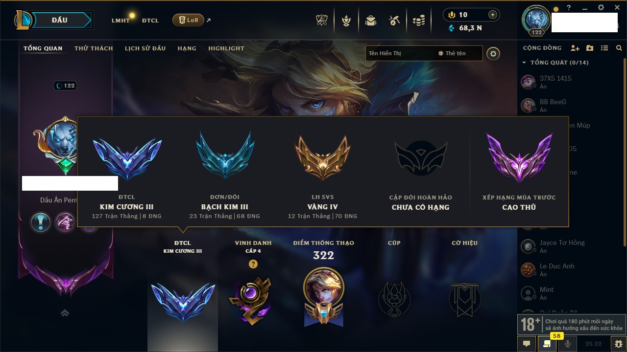 Rank Đơn: Bạch Kim III Khung: Bạch kim Tướng: 170 - Còn 68342 THX Trang Phục: 70 Rank ĐTCL: Kim Cương III Linh Thú: 318