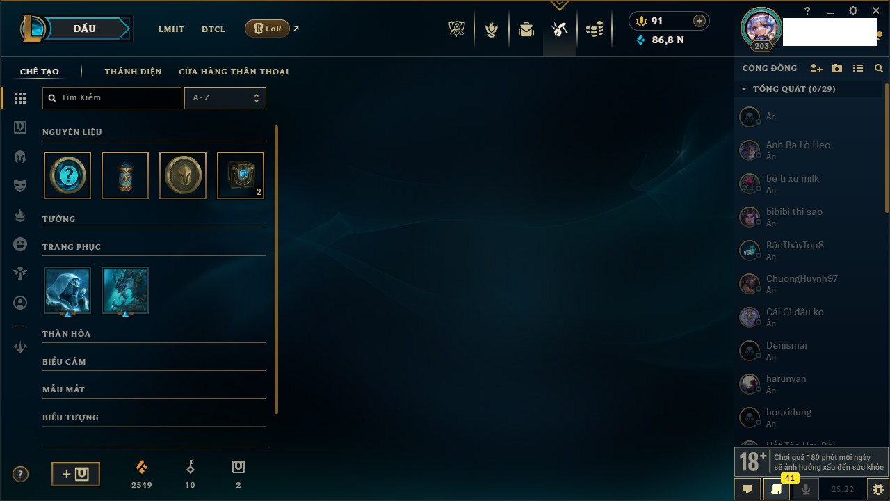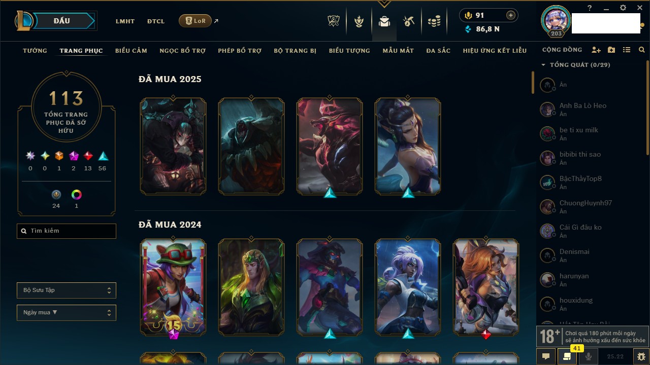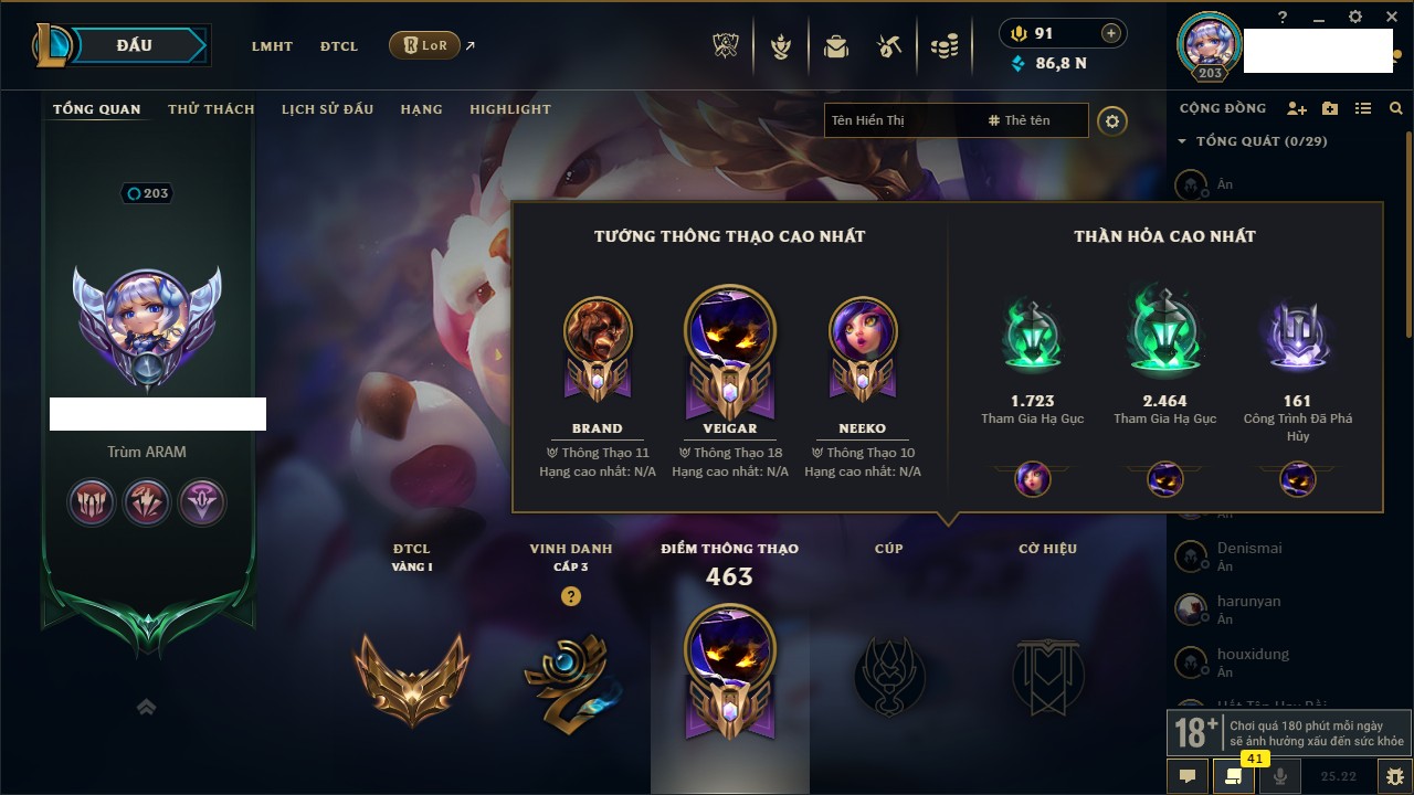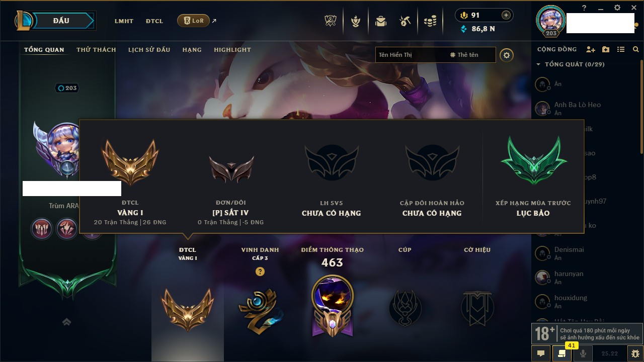 Rank Đơn: Chưa rank mùa nào Khung: Chưa có khung Tướng: 172 - Còn 4672 THX Trang Phục: 31 Rank ĐTCL: Bạc I Linh Thú: 230