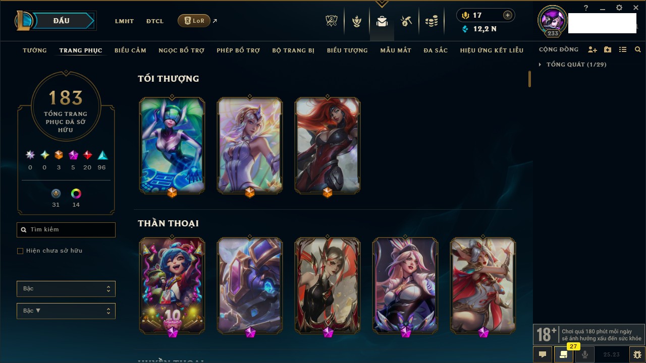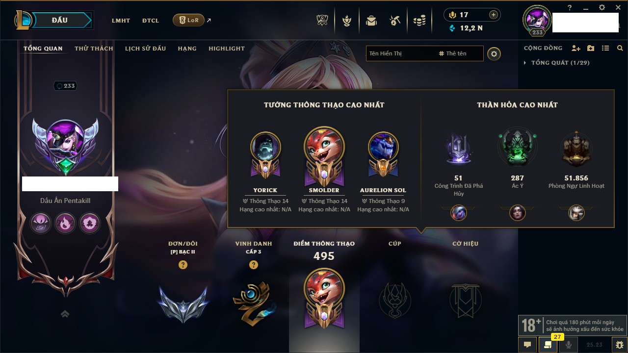 Rank Đơn: Bạc IIKhung: Chưa có khungTướng: 145 - Còn 12230 THXTrang Phục: 183Rank ĐTCL: Chưa RankLinh Thú: 71