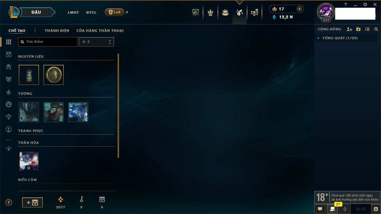 Rank Đơn: Chưa RankKhung: Chưa có khungTướng: 169 - Còn 43188 THXTrang Phục: 205Rank ĐTCL: Chưa RankLinh Thú: 259