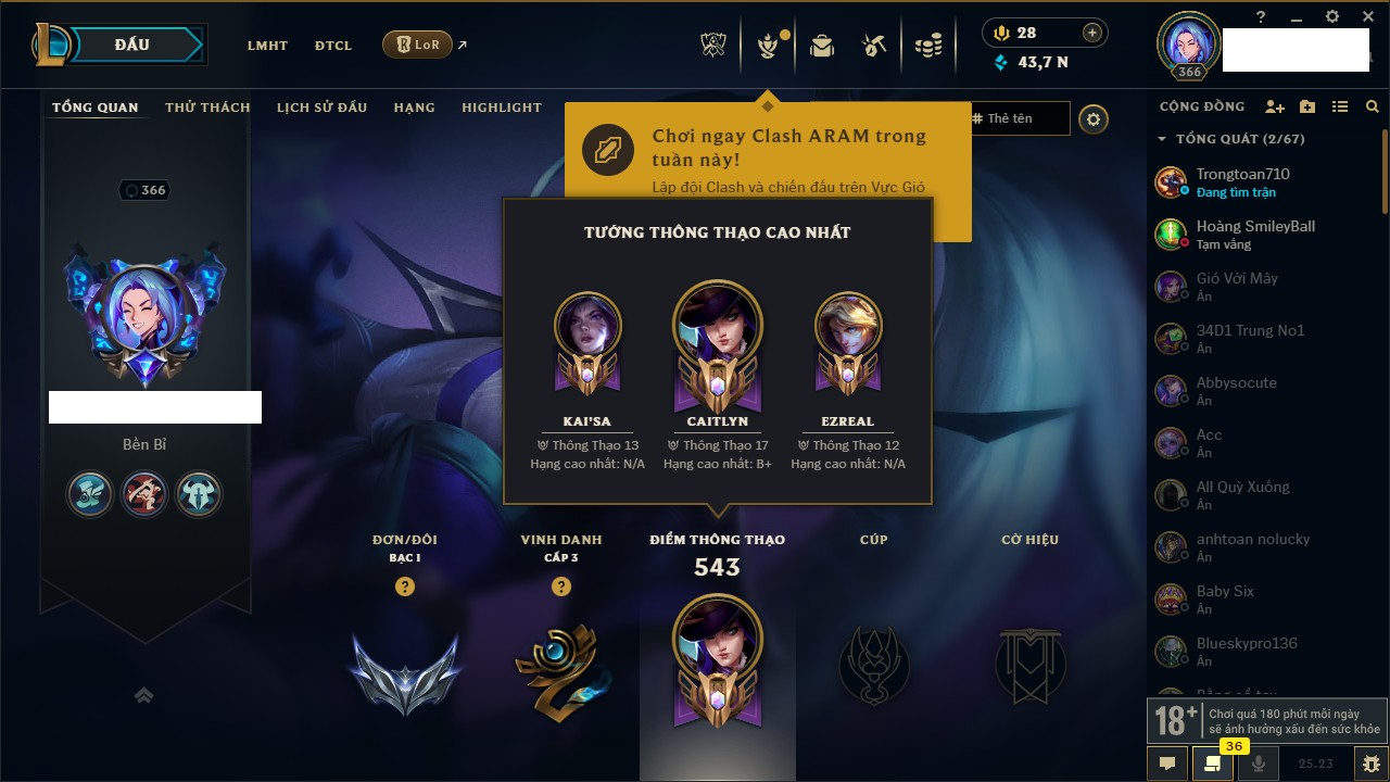 Rank Đơn: Đồng IKhung: ĐồngTướng: 168 - Còn 11447 THXTrang Phục: 245Rank ĐTCL: Chưa RankLinh Thú: 53