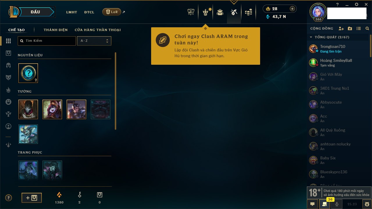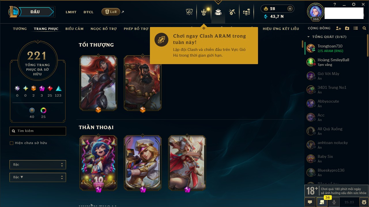 Rank Đơn: Vàng IIIKhung: BạcTướng: 171 - Còn 101359 THXTrang Phục: 88Rank ĐTCL: Kim Cương IVLinh Thú: 200