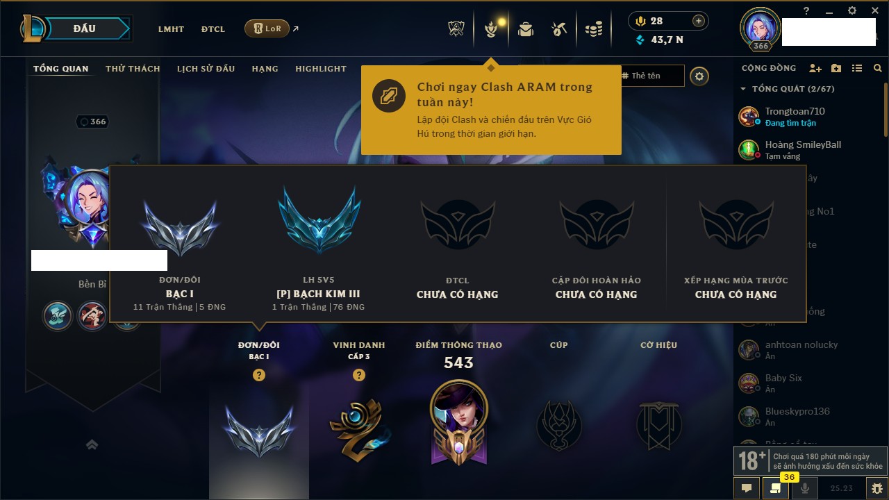Rank Đơn: Bạc IIIKhung: Chưa có khungTướng: 163 - Còn 66843 THXTrang Phục: 182Rank ĐTCL: Kim Cương IVLinh Thú: 114