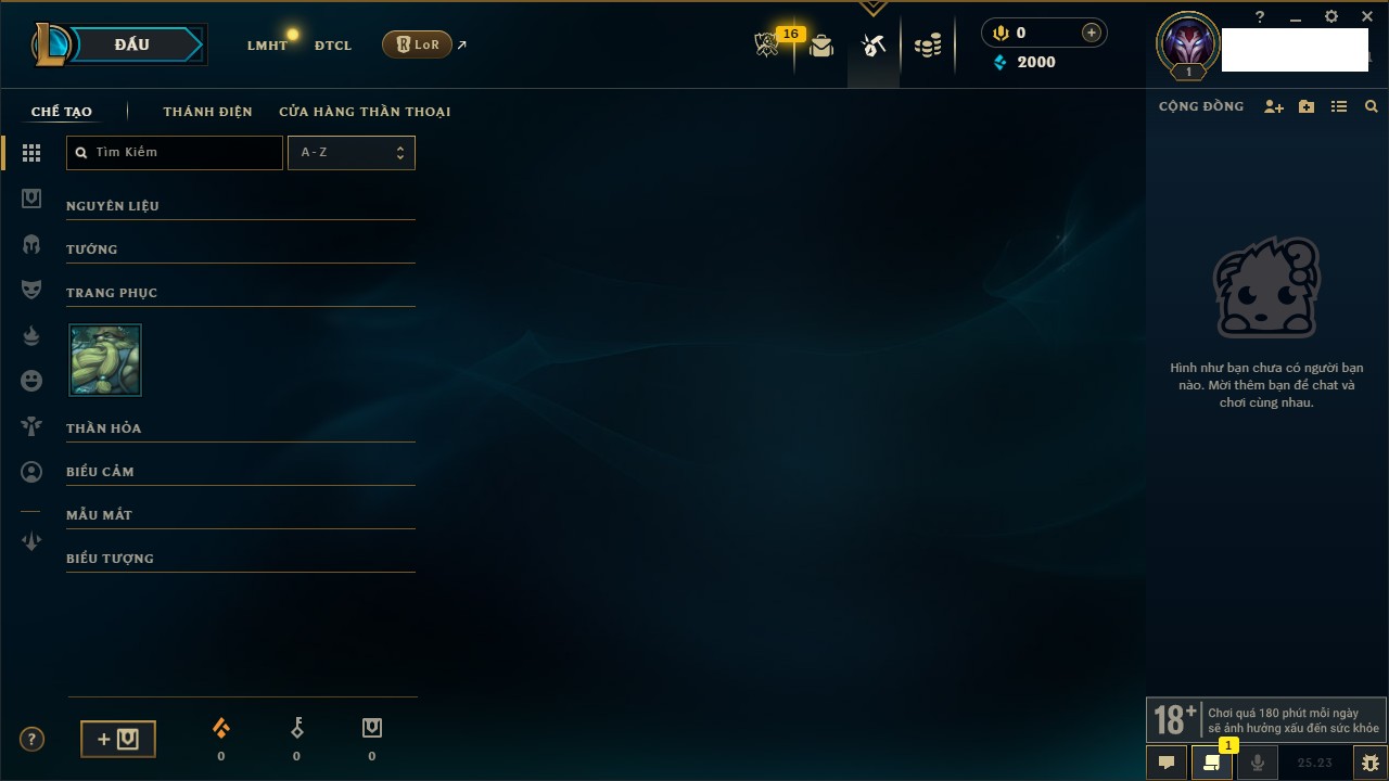Rank Đơn: Lục Bảo IVKhung: VàngTướng: 171 - Còn 154648 THXTrang Phục: 203Rank ĐTCL: Bạch Kim IVLinh Thú: 69