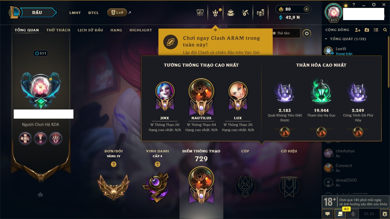 Rank Đơn: Bạc IVKhung: BạcTướng: 171 - Còn 102637 THXTrang Phục: 169Rank ĐTCL: Vàng IILinh Thú: 127