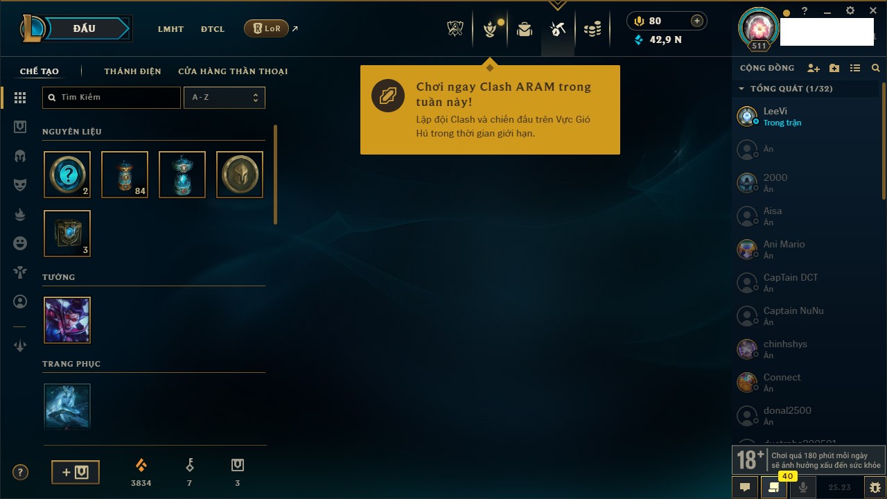 Rank Đơn: Bạc IVKhung: BạcTướng: 171 - Còn 161685 THXTrang Phục: 139Rank ĐTCL: Đồng ILinh Thú: 51