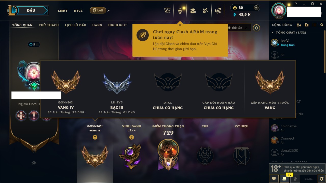 Rank Đơn: Bạc IIIKhung: VàngTướng: 171 - Còn 386278 THXTrang Phục: 170Rank ĐTCL: Chưa RankLinh Thú: 30