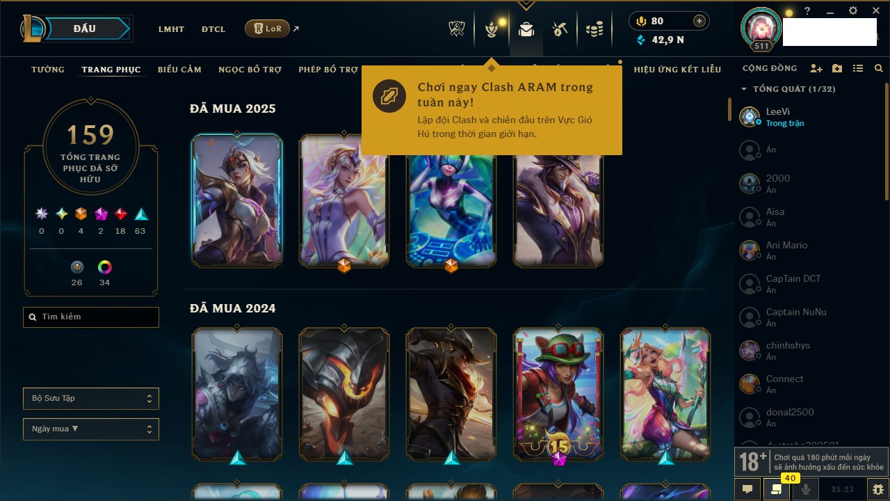 Rank Đơn: Bạc IIIKhung: BạcTướng: 168 - Còn 101710 THXTrang Phục: 184Rank ĐTCL: Chưa RankLinh Thú: 17