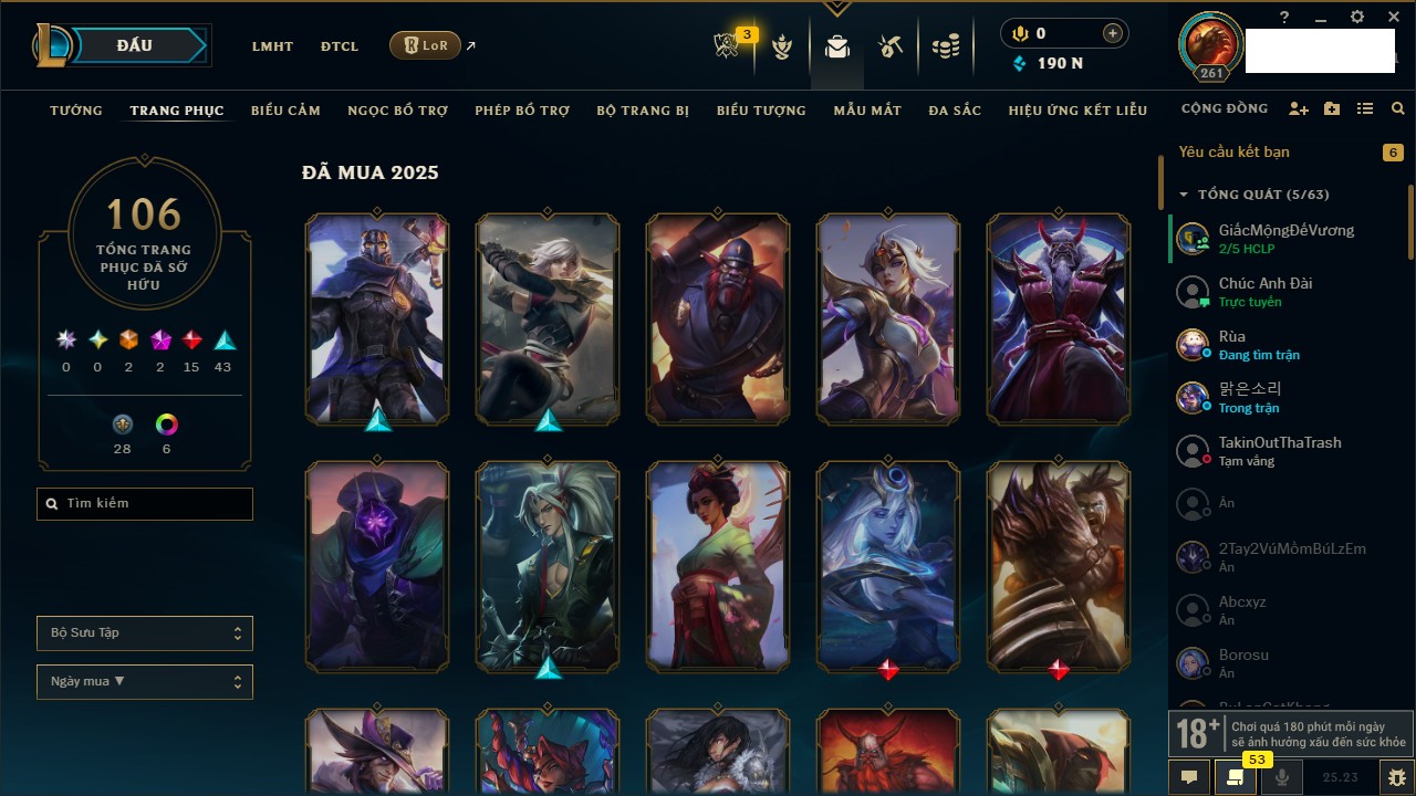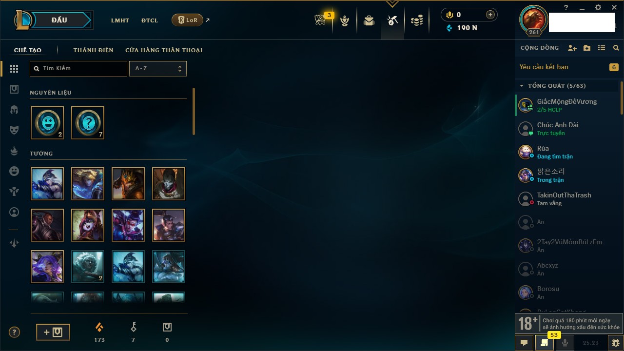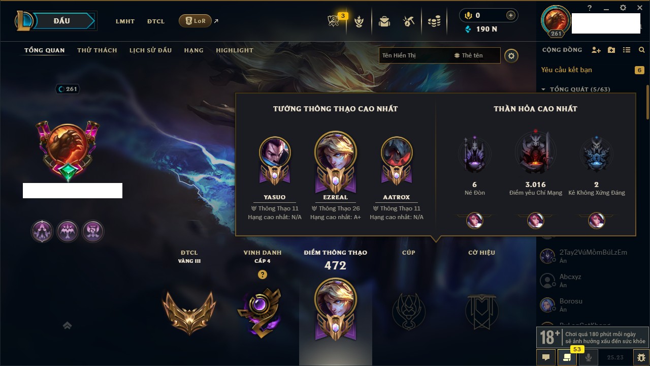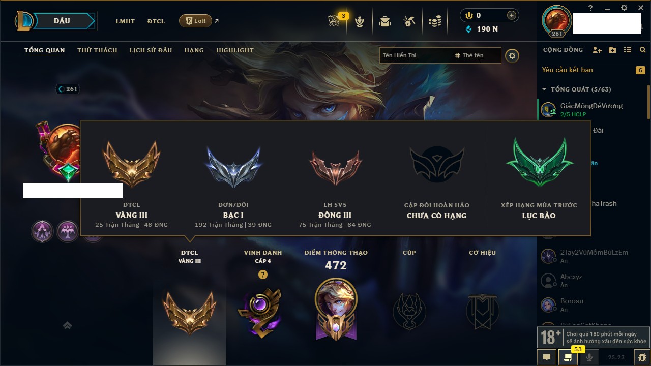 Rank Đơn: Bạch Kim IV Khung: Chưa có khung Tướng: 172 - Còn 29488 THX Trang Phục: 120 Rank ĐTCL: Bạc III Linh Thú: 50