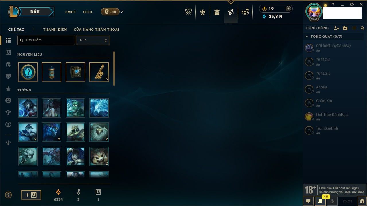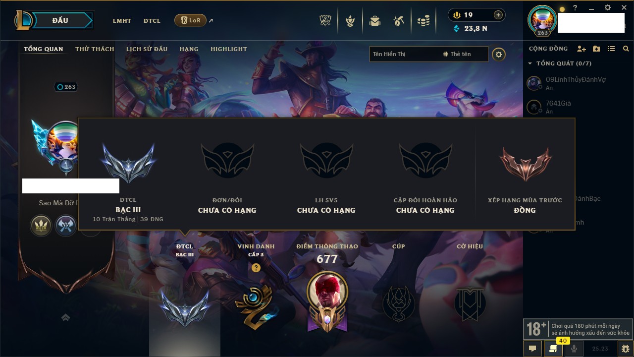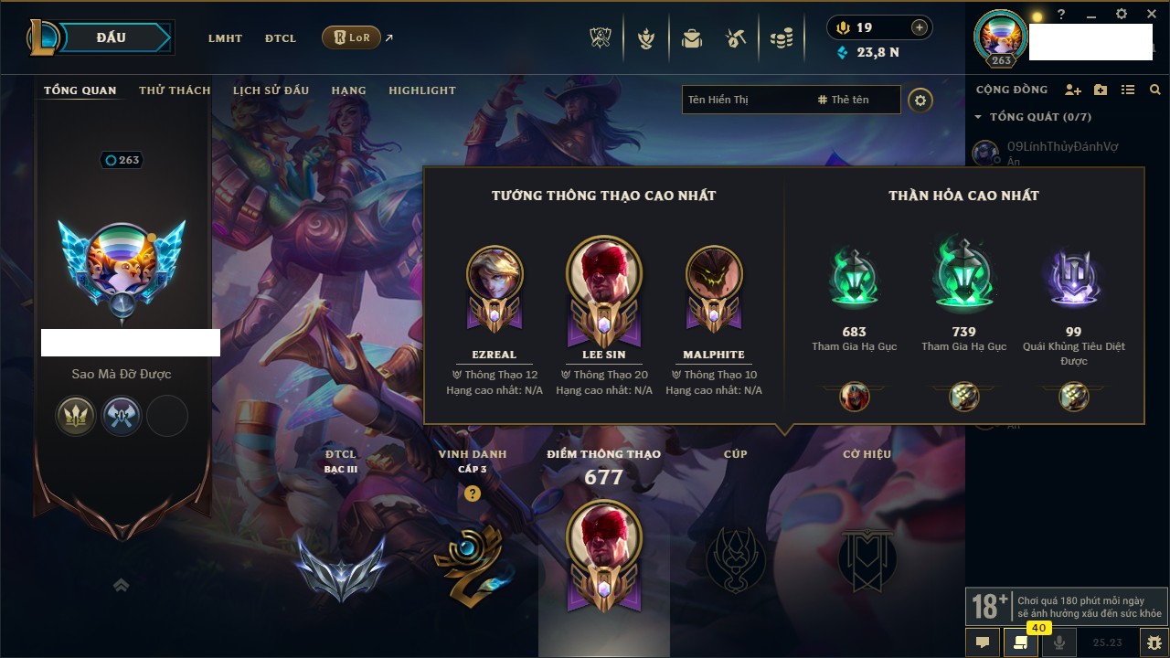 Rank Đơn: Chưa RankKhung: Bạch kimTướng: 171 - Còn 1712 THXTrang Phục: 168Rank ĐTCL: Chưa RankLinh Thú: 53