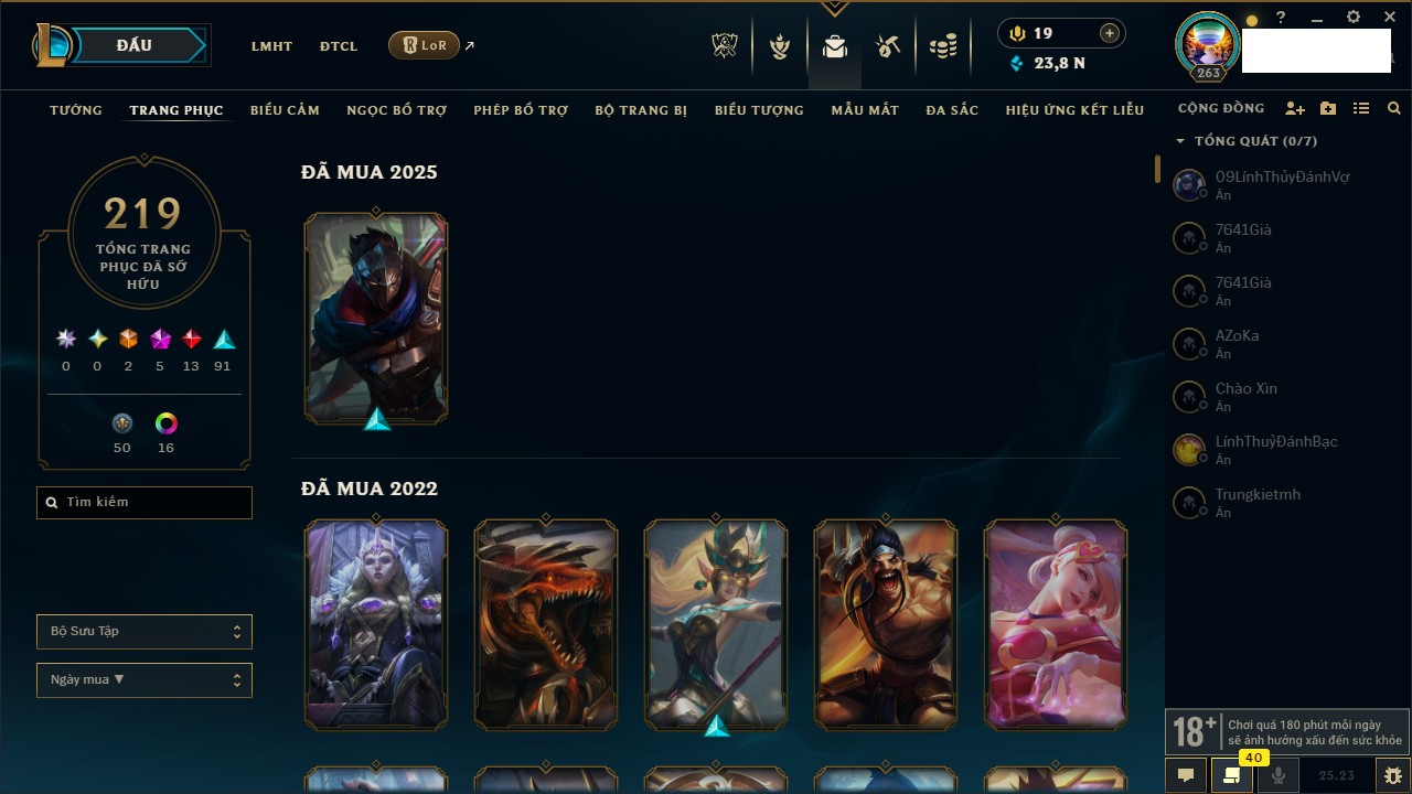 Rank Đơn: Chưa RankKhung: Chưa có khungTướng: 105 - Còn 590 THXTrang Phục: 124Rank ĐTCL: Chưa RankLinh Thú: 61