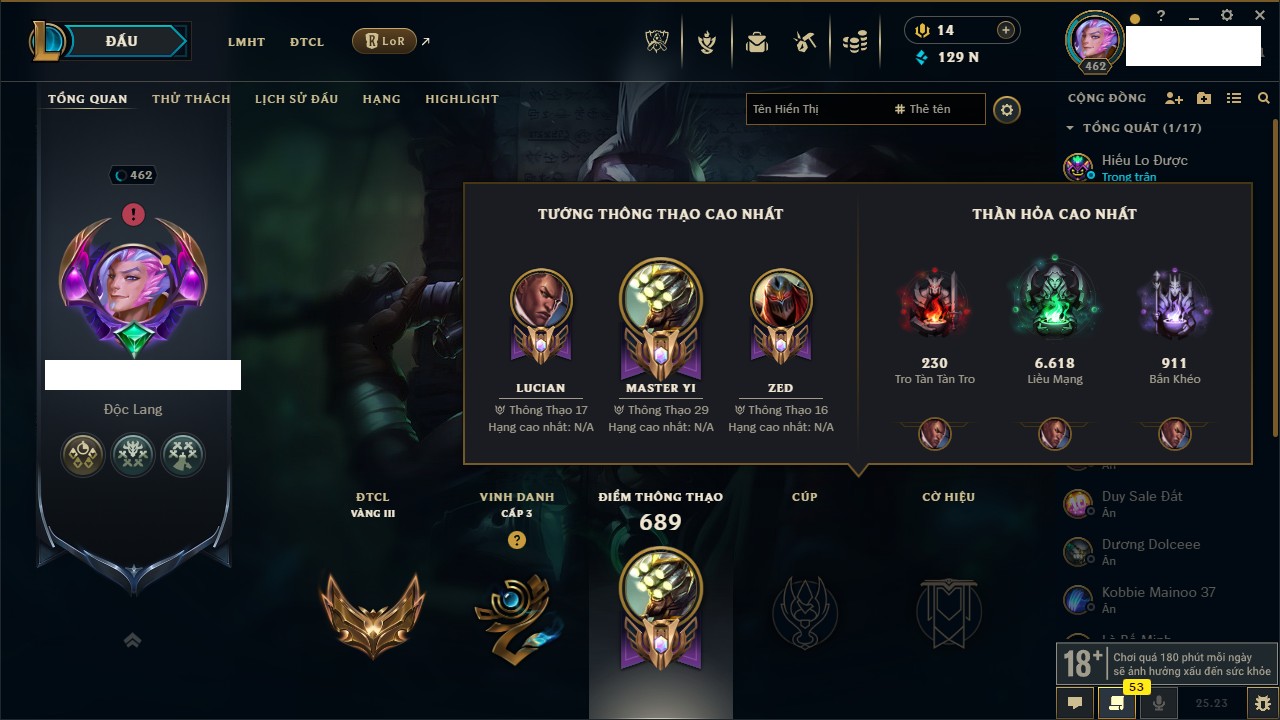 Rank Đơn: Lục Bảo IVKhung: Bạch kimTướng: 171 - Còn 128452 THXTrang Phục: 193Rank ĐTCL: Bạc IIILinh Thú: 100
