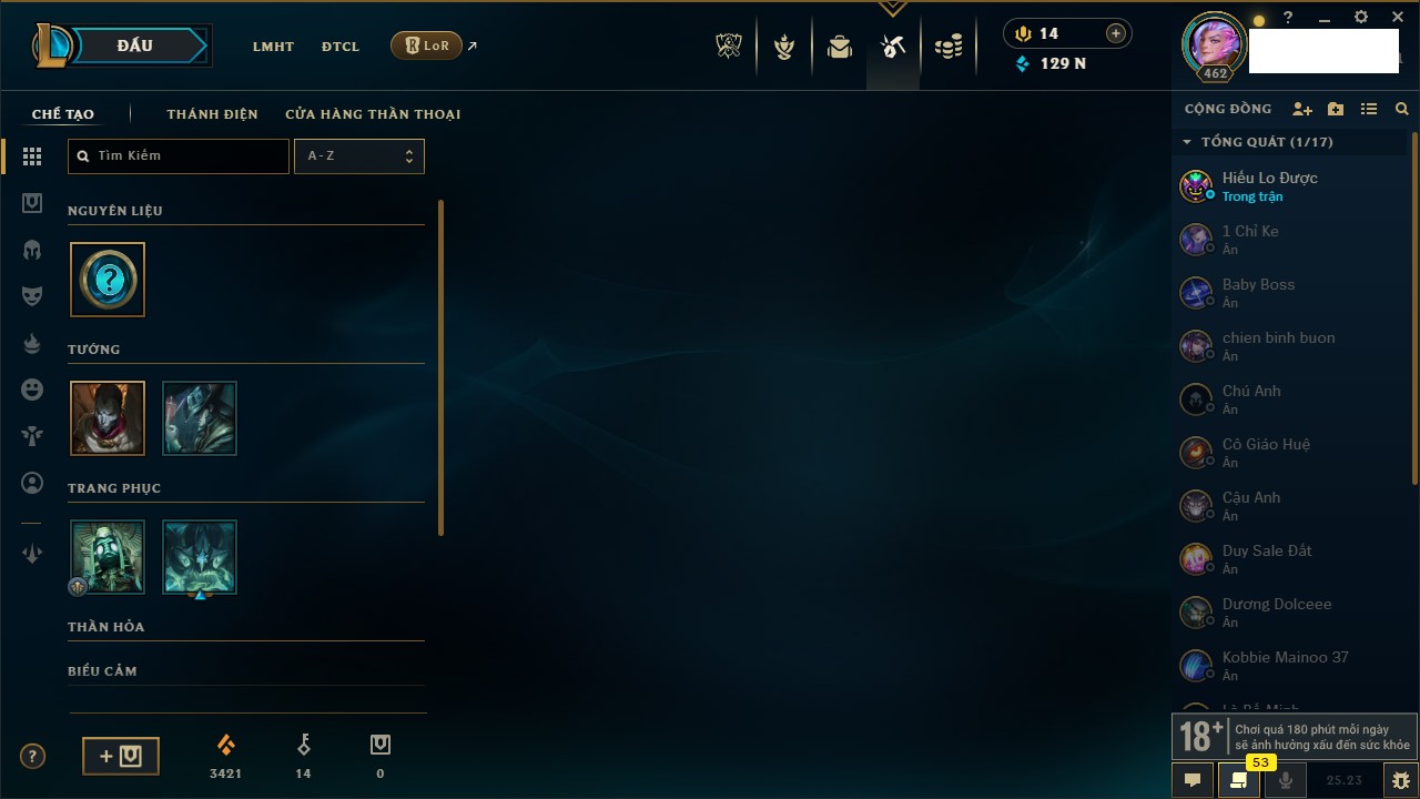 Rank Đơn: Vàng IIIKhung: BạcTướng: 171 - Còn 101359 THXTrang Phục: 88Rank ĐTCL: Kim Cương IVLinh Thú: 200