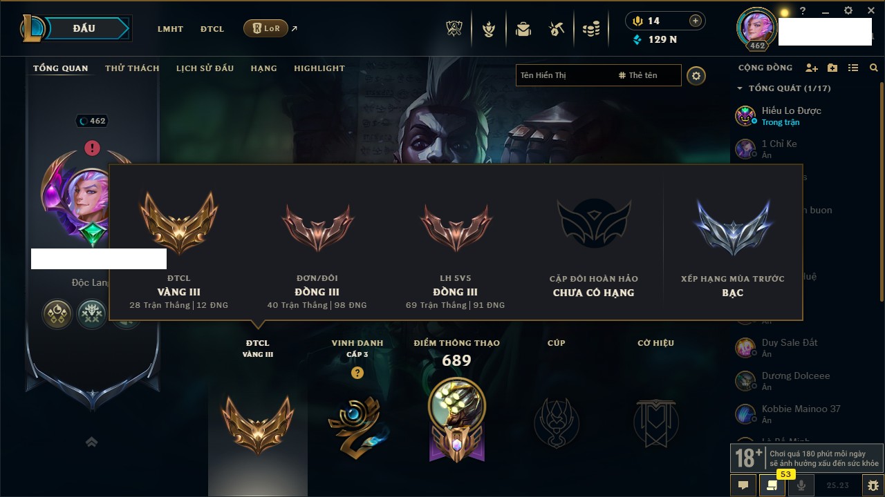 Rank Đơn: Bạc IIIKhung: Chưa có khungTướng: 163 - Còn 66843 THXTrang Phục: 182Rank ĐTCL: Kim Cương IVLinh Thú: 114