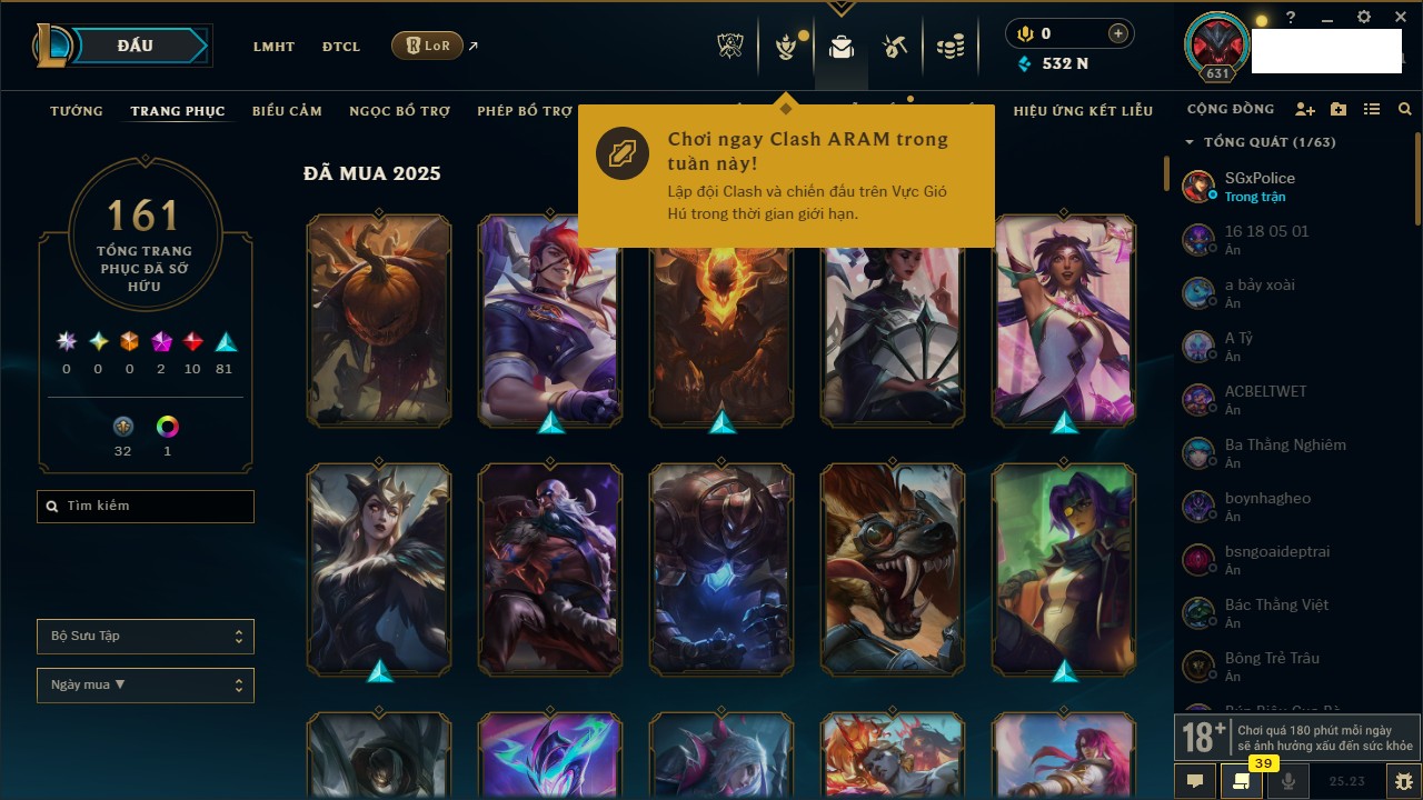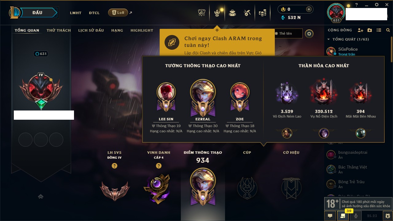 Rank Đơn: Đồng IKhung: ĐồngTướng: 168 - Còn 11447 THXTrang Phục: 245Rank ĐTCL: Chưa RankLinh Thú: 53