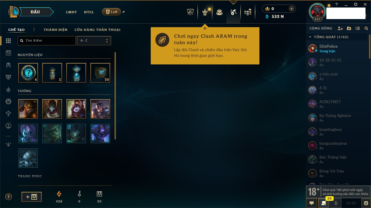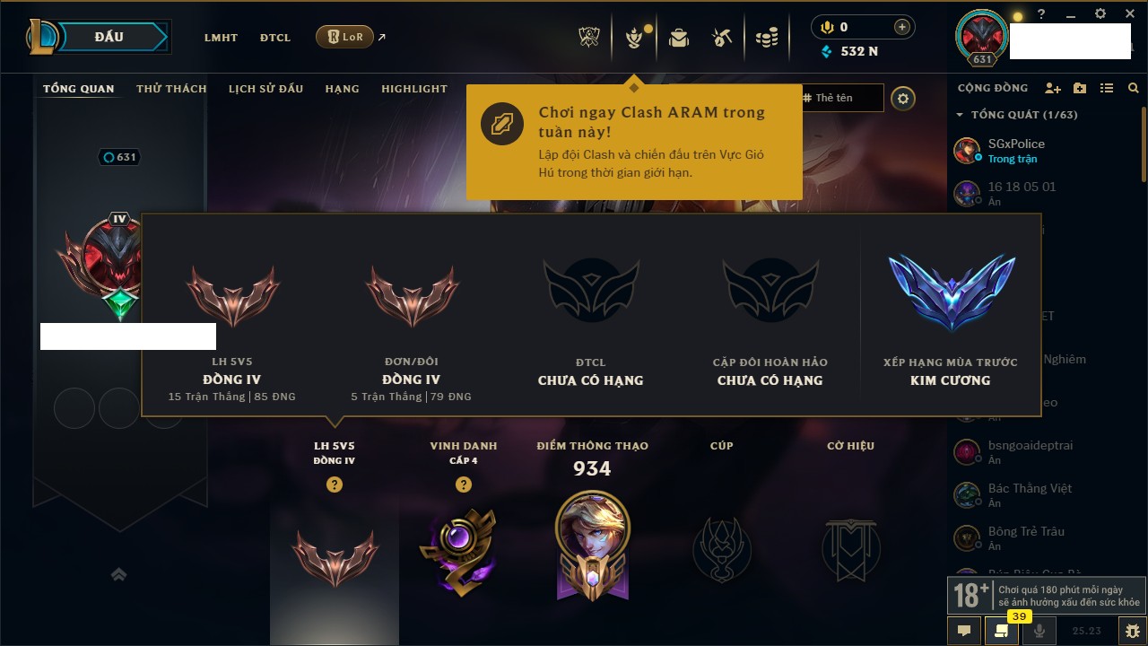 Rank Đơn: Vàng IIIKhung: BạcTướng: 171 - Còn 101359 THXTrang Phục: 88Rank ĐTCL: Kim Cương IVLinh Thú: 200