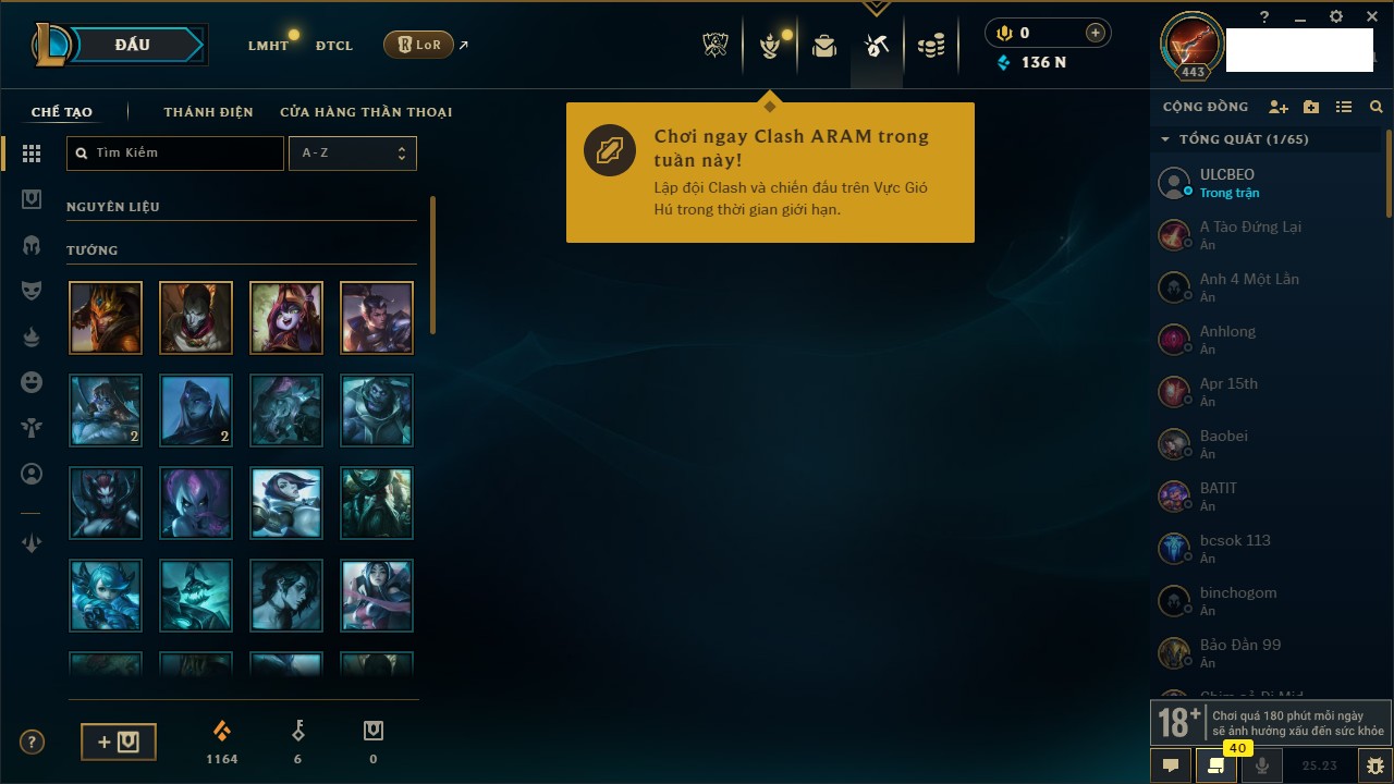 Rank Đơn: Lục Bảo IVKhung: VàngTướng: 171 - Còn 154648 THXTrang Phục: 203Rank ĐTCL: Bạch Kim IVLinh Thú: 69