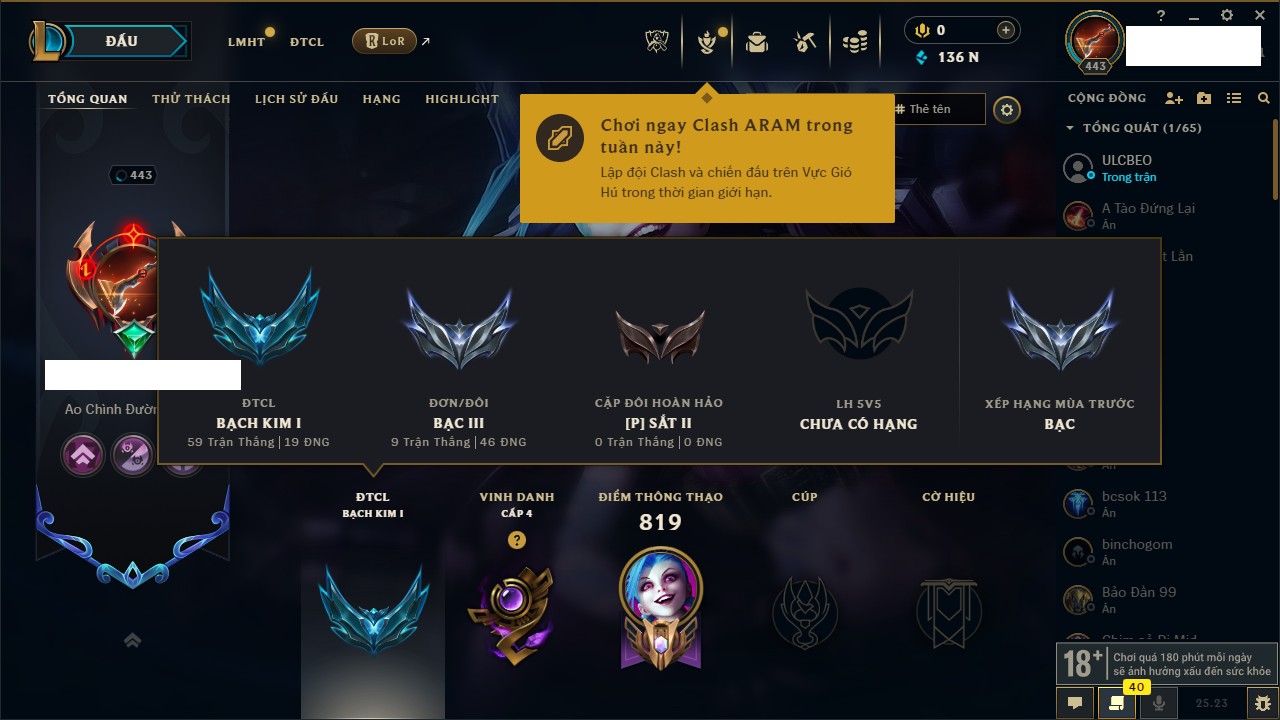 Rank Đơn: Bạch Kim IIIKhung: Bạch kimTướng: 171 - Còn 136108 THXTrang Phục: 261Rank ĐTCL: Bạc IVLinh Thú: 73