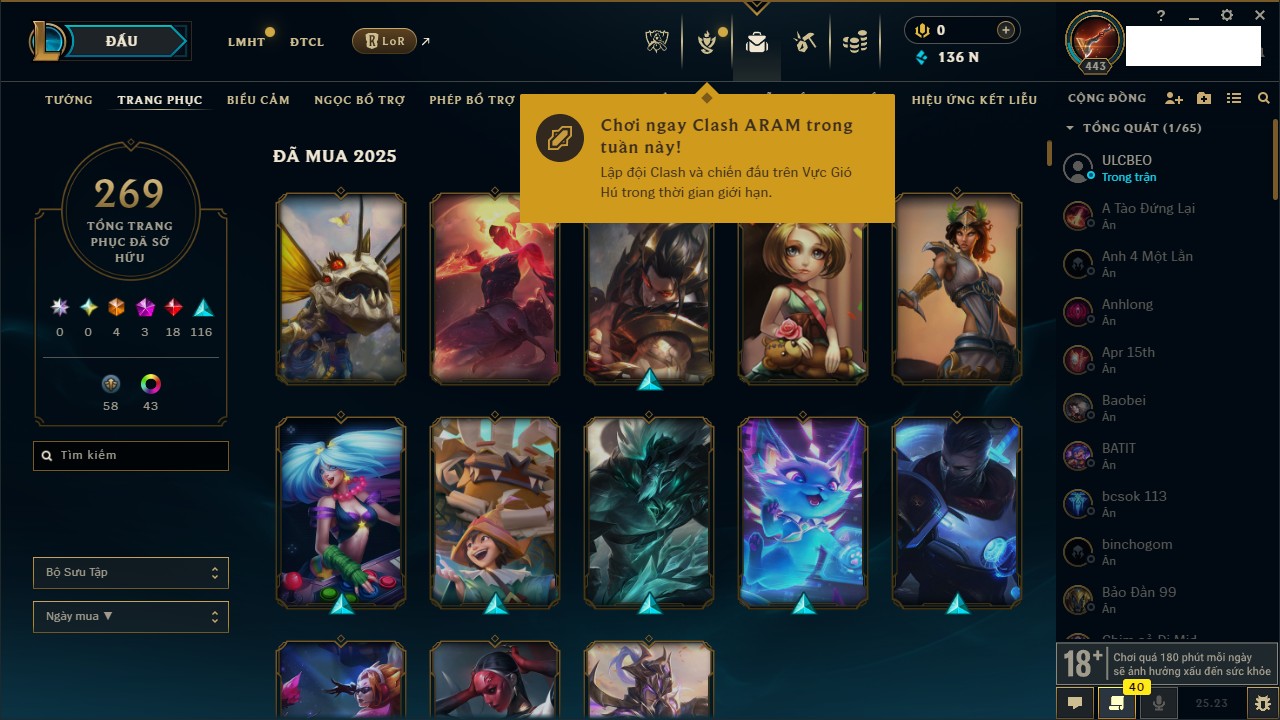 Rank Đơn: Vàng IIKhung: VàngTướng: 170 - Còn 243330 THXTrang Phục: 230Rank ĐTCL: Chưa RankLinh Thú: 68