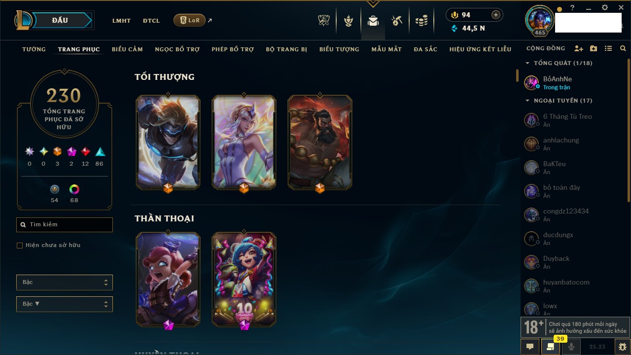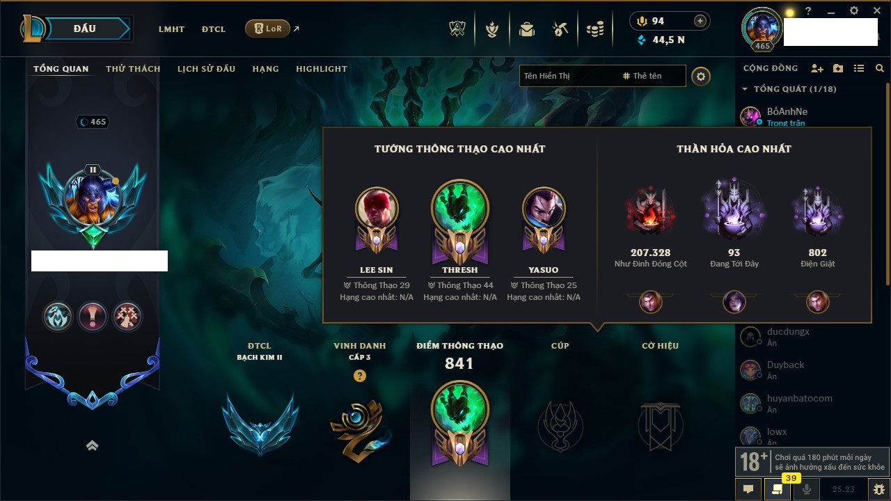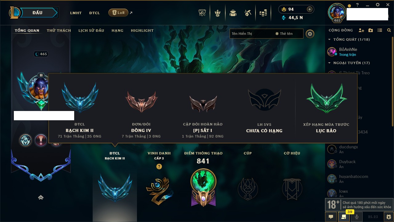 Rank Đơn: Bạc IIKhung: Bạch kimTướng: 169 - Còn 81813 THXTrang Phục: 301Rank ĐTCL: Chưa RankLinh Thú: 140