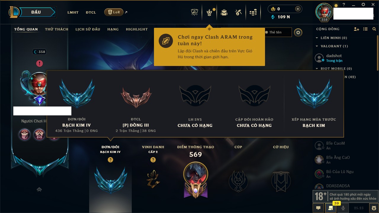 Rank Đơn: Vàng IIIKhung: BạcTướng: 171 - Còn 101359 THXTrang Phục: 88Rank ĐTCL: Kim Cương IVLinh Thú: 200