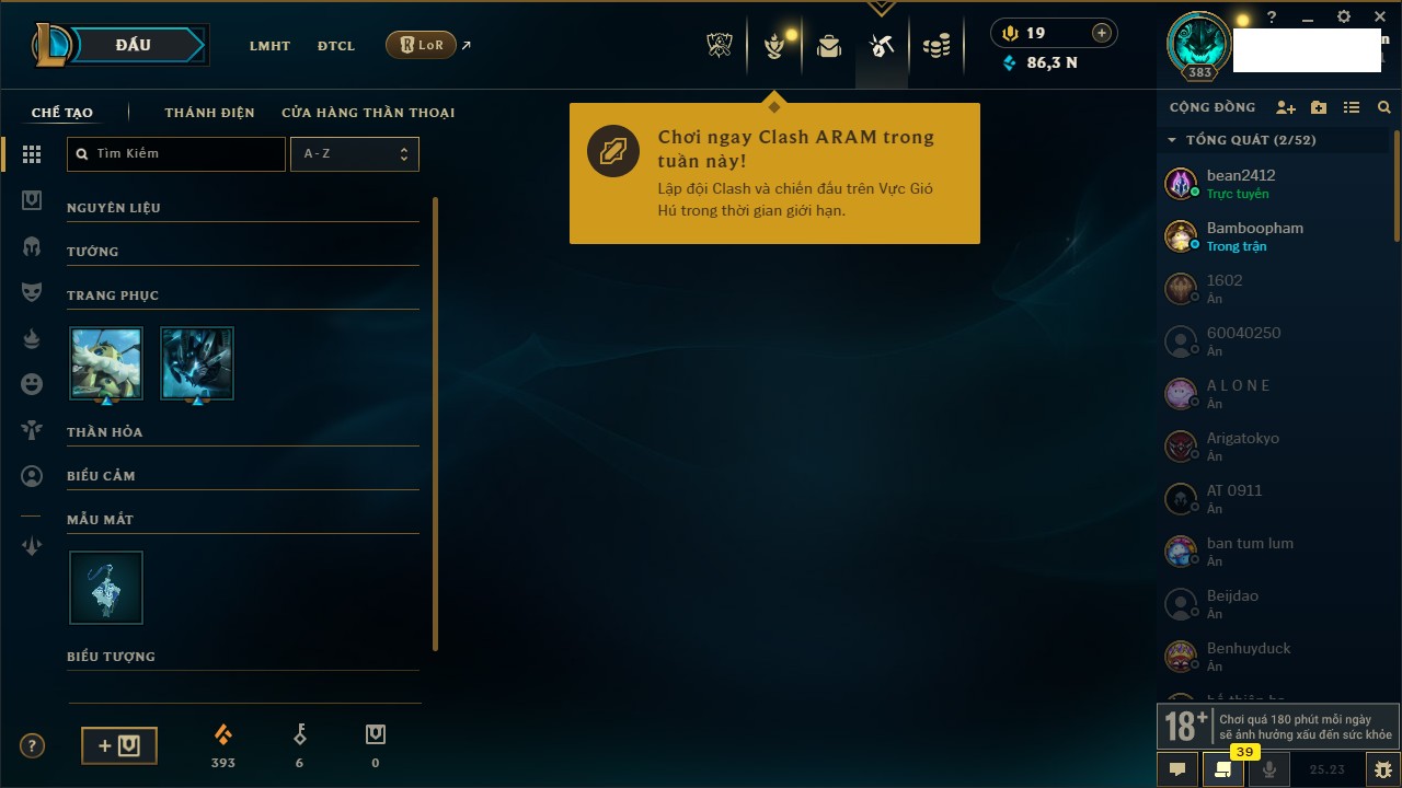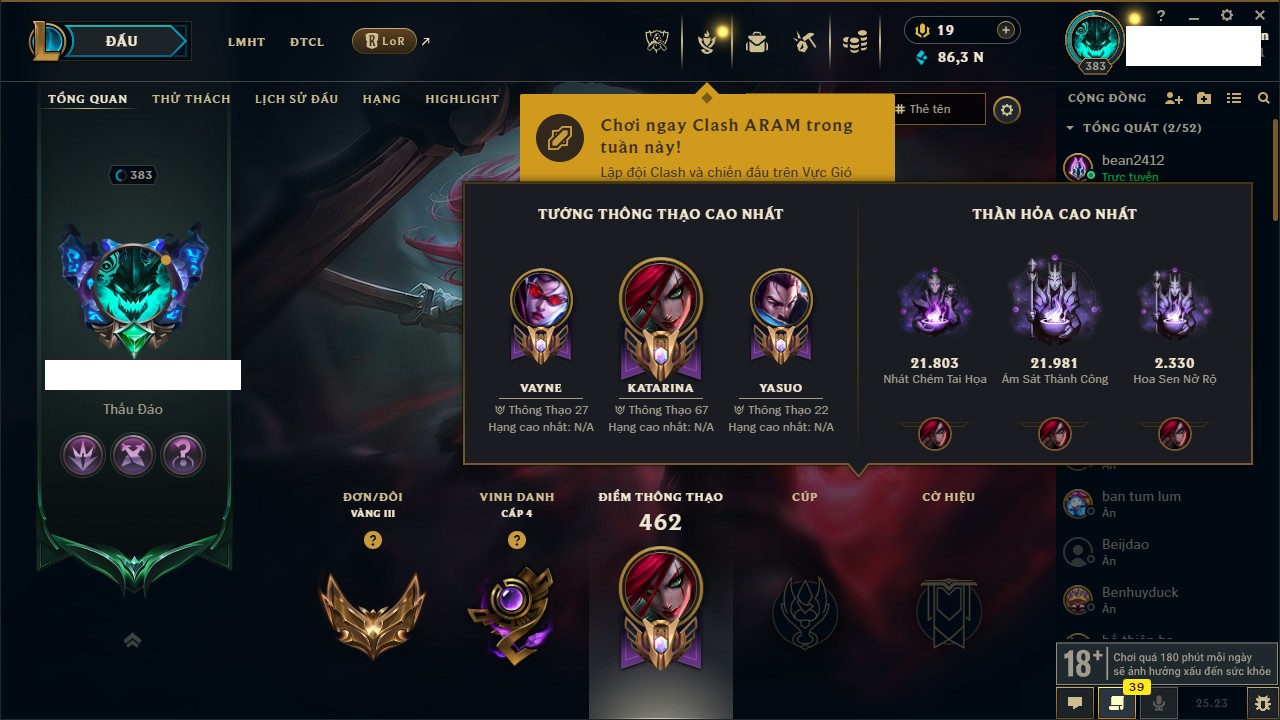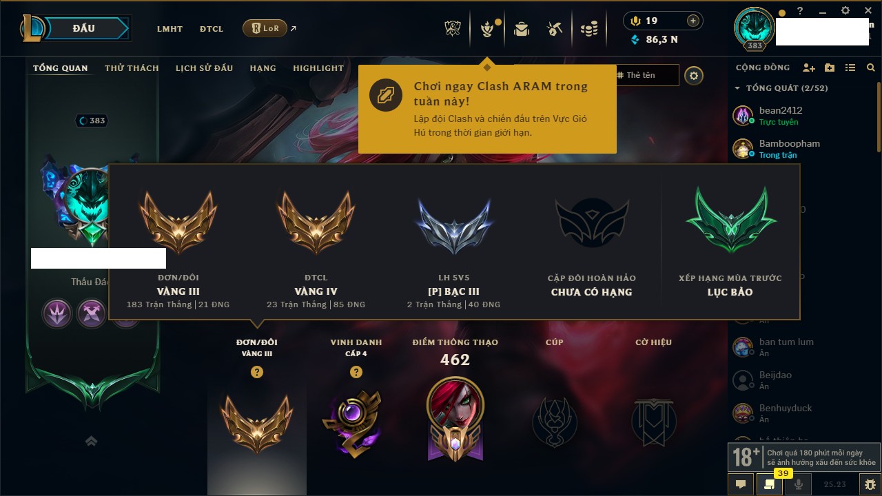 Rank Đơn: Vàng IIIKhung: BạcTướng: 171 - Còn 101359 THXTrang Phục: 88Rank ĐTCL: Kim Cương IVLinh Thú: 200