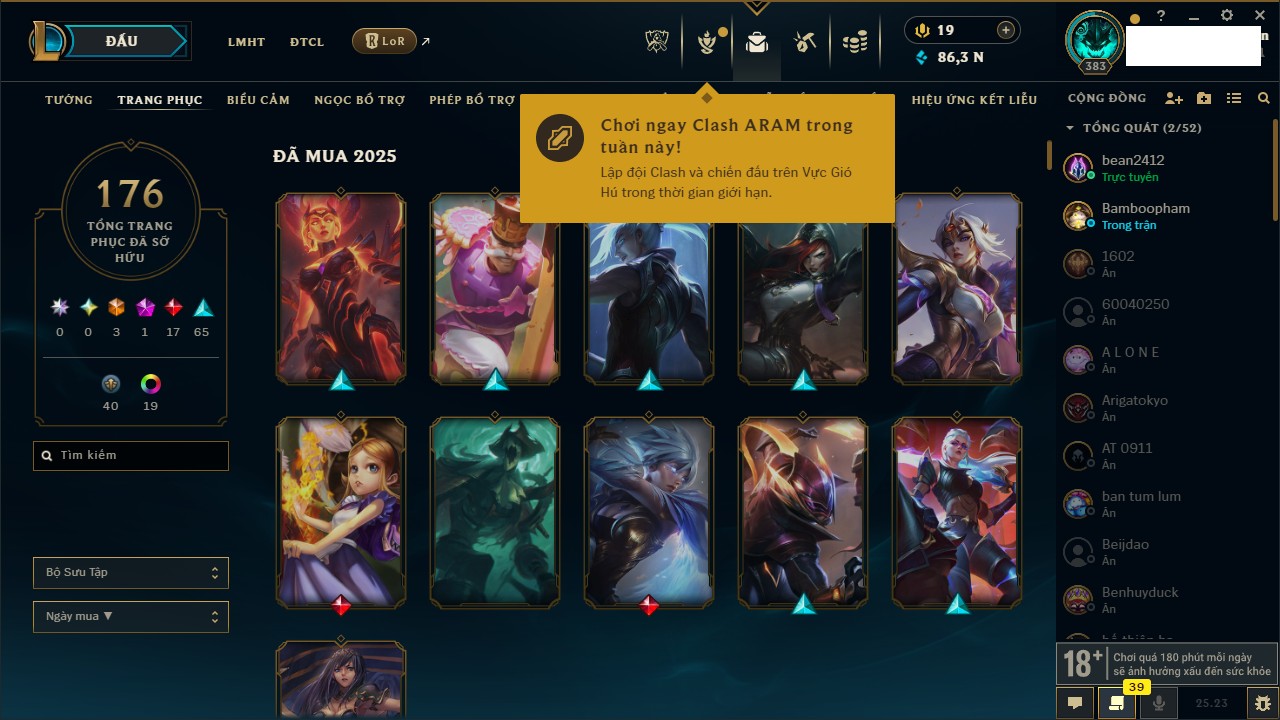 Rank Đơn: Đồng IKhung: ĐồngTướng: 168 - Còn 11447 THXTrang Phục: 245Rank ĐTCL: Chưa RankLinh Thú: 53