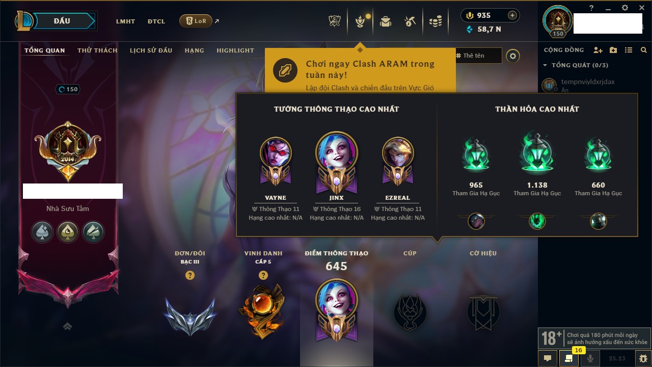 Rank Đơn: Bạch Kim IIIKhung: Bạch kimTướng: 170 - Còn 61079 THXTrang Phục: 352Rank ĐTCL: Sắt IILinh Thú: 70