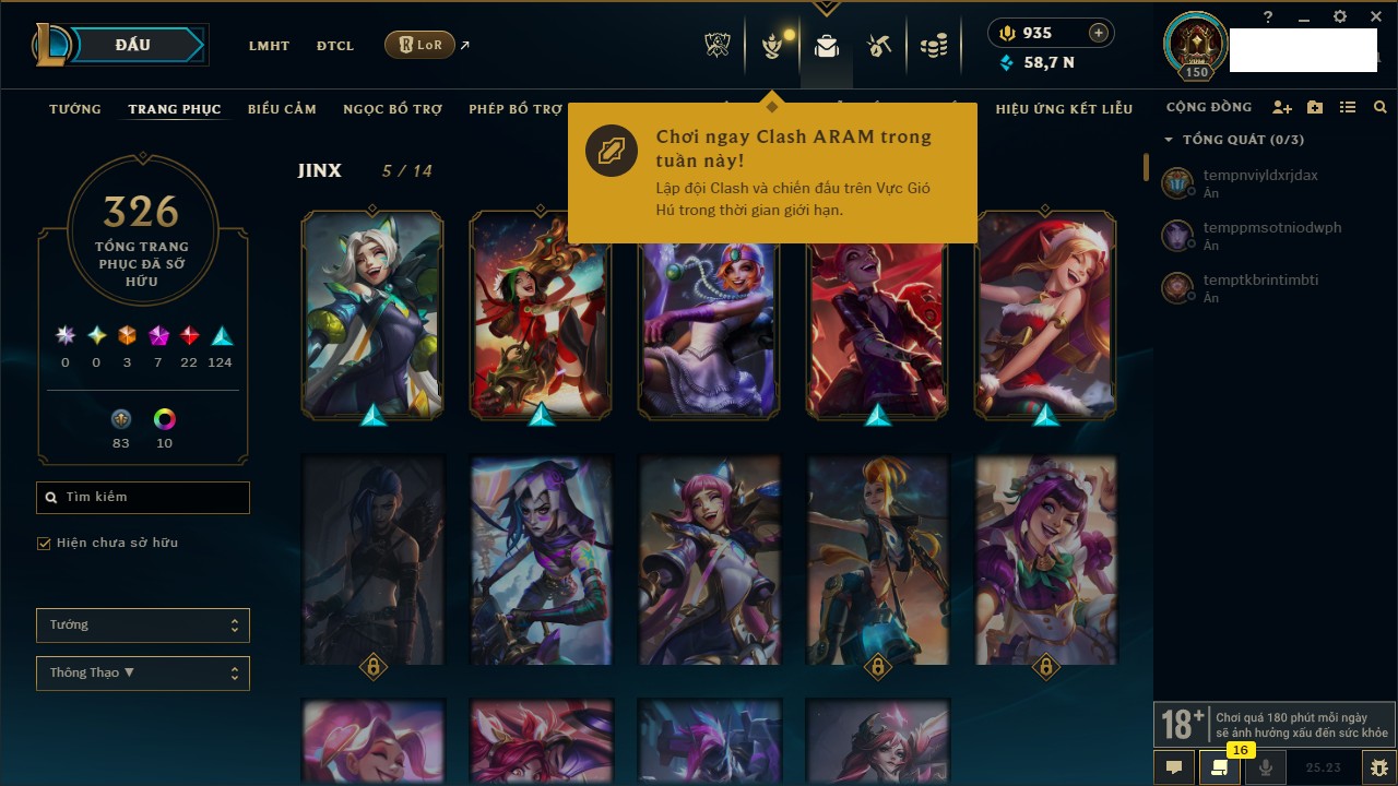 Rank Đơn: Vàng IKhung: Bạch kimTướng: 170 - Còn 212450 THXTrang Phục: 214Rank ĐTCL: Bạch Kim IVLinh Thú: 221