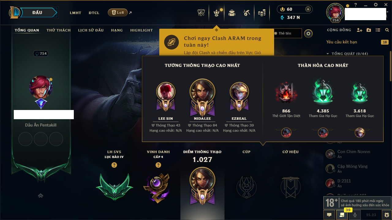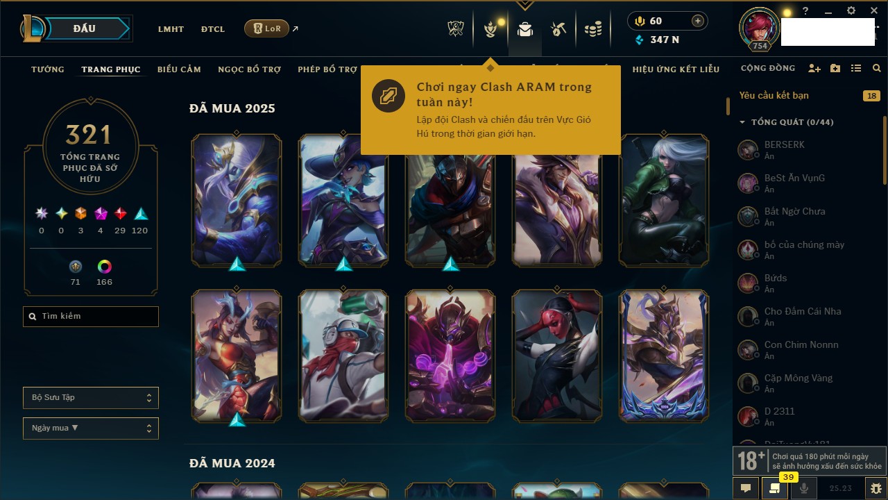 Rank Đơn: Bạch Kim IIIKhung: Bạch kimTướng: 170 - Còn 61079 THXTrang Phục: 352Rank ĐTCL: Sắt IILinh Thú: 70