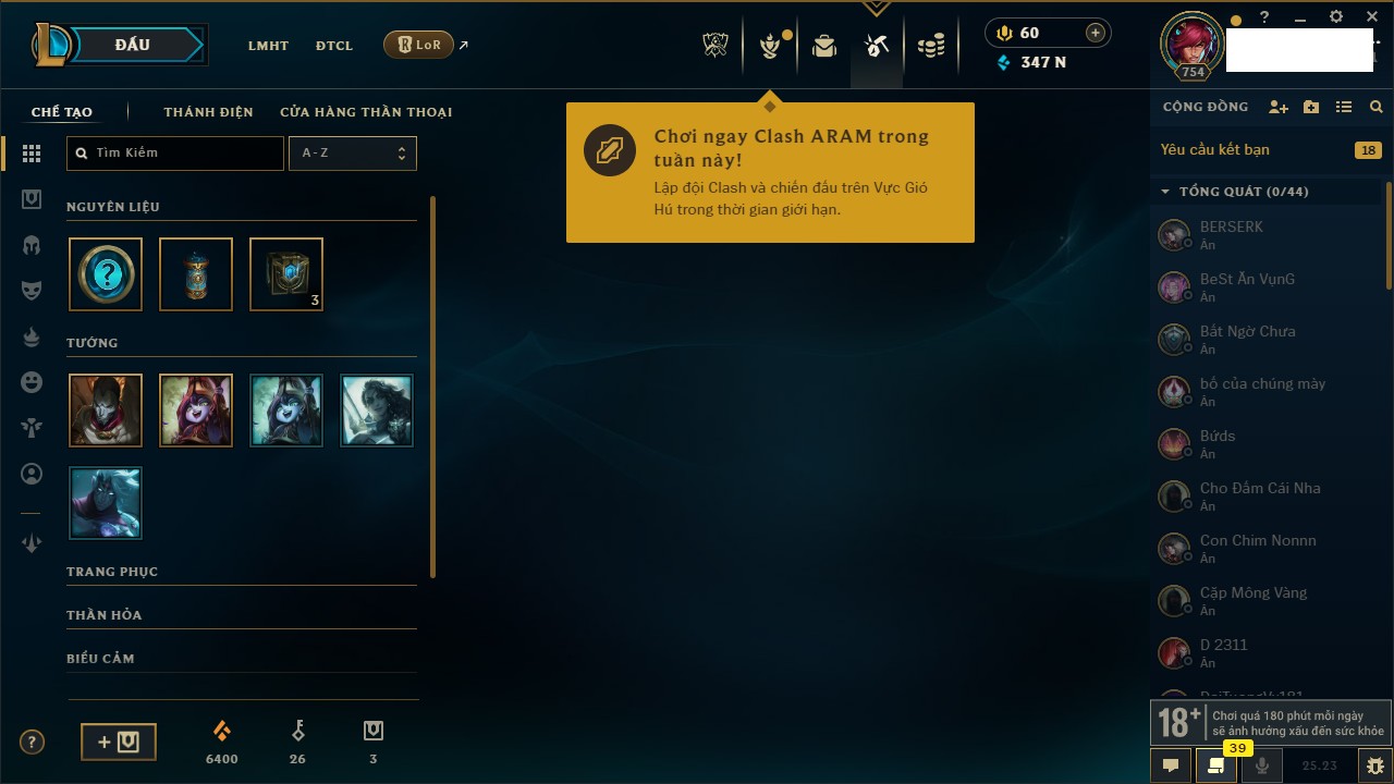 Rank Đơn: Vàng IVKhung: VàngTướng: 171 - Còn 175357 THXTrang Phục: 348Rank ĐTCL: Chưa RankLinh Thú: 46