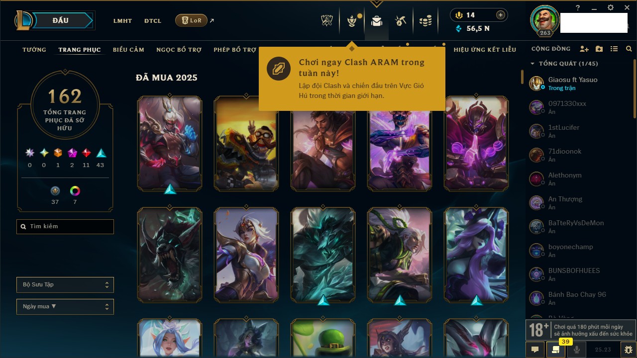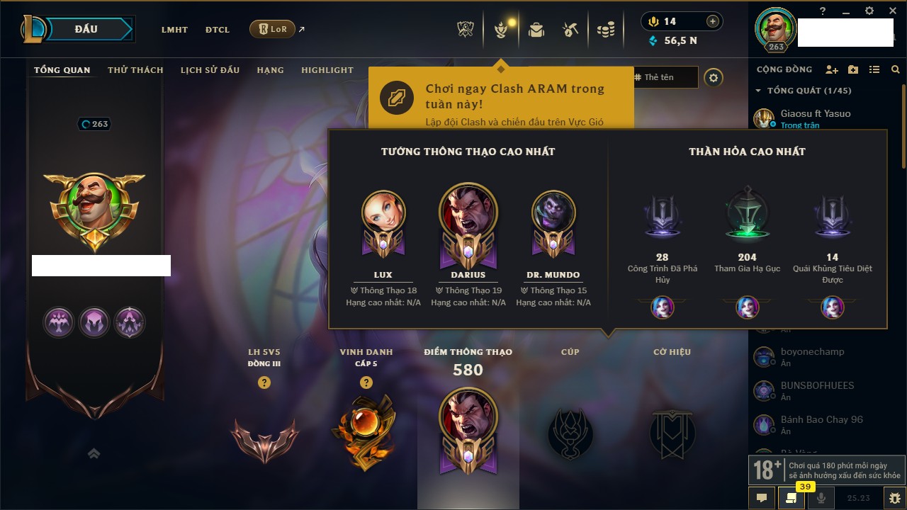 Rank Đơn: Đồng IIKhung: Chưa có khungTướng: 170 - Còn 56487 THXTrang Phục: 90Rank ĐTCL: Chưa RankLinh Thú: 129