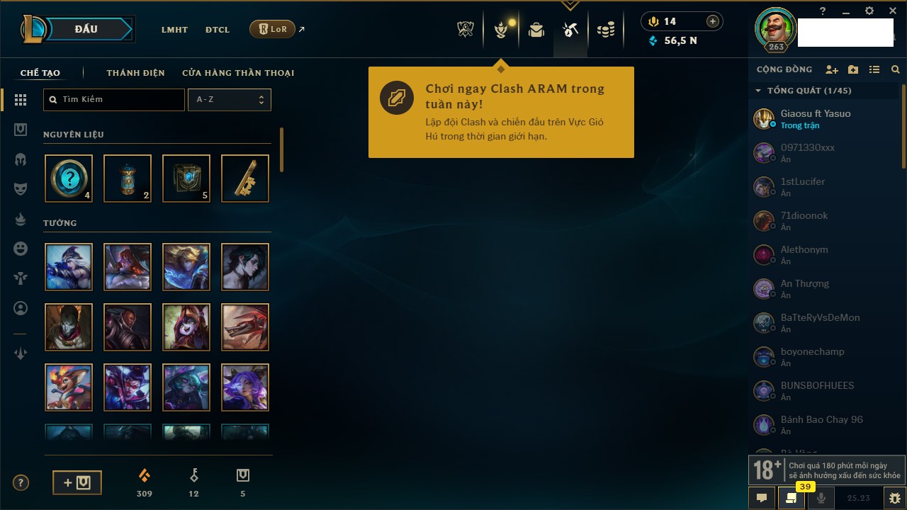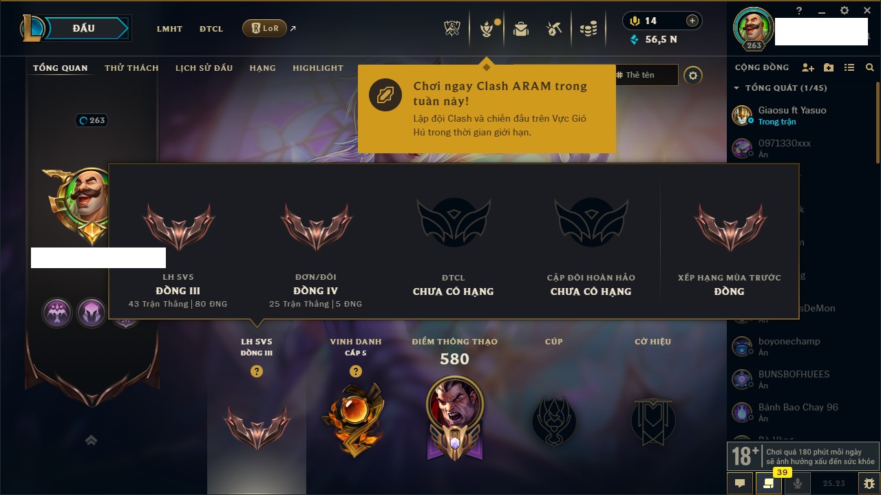 Rank Đơn: Vàng IVKhung: VàngTướng: 146 - Còn 89110 THXTrang Phục: 63Rank ĐTCL: Vàng IIILinh Thú: 41