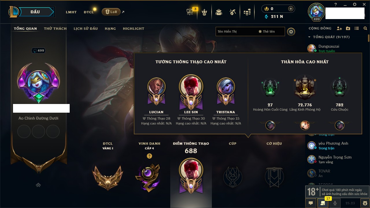 Rank Đơn: Bạch Kim IIIKhung: Bạch kimTướng: 171 - Còn 136108 THXTrang Phục: 261Rank ĐTCL: Bạc IVLinh Thú: 73