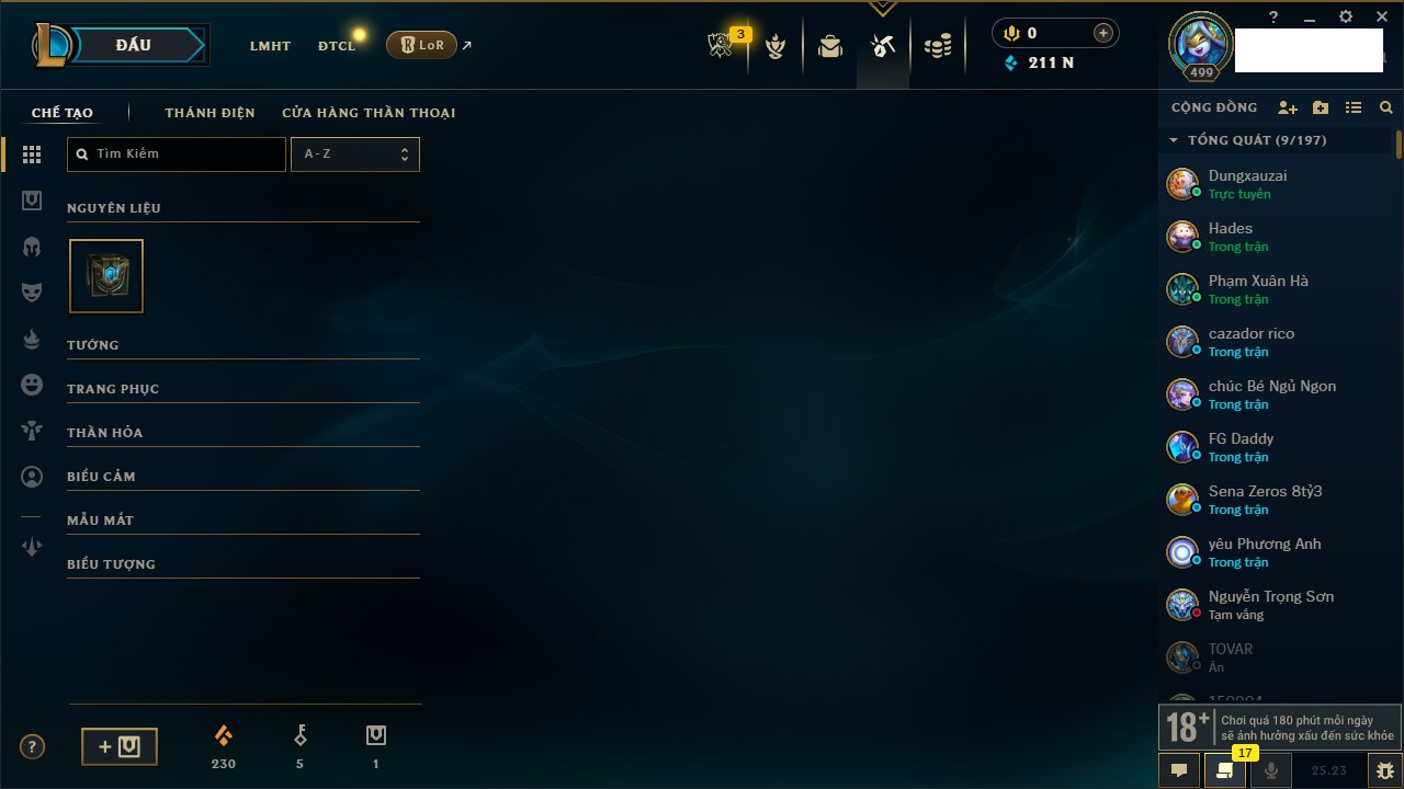 Rank Đơn: Đồng IIKhung: Chưa có khungTướng: 170 - Còn 2078 THXTrang Phục: 72Rank ĐTCL: Đồng ILinh Thú: 133