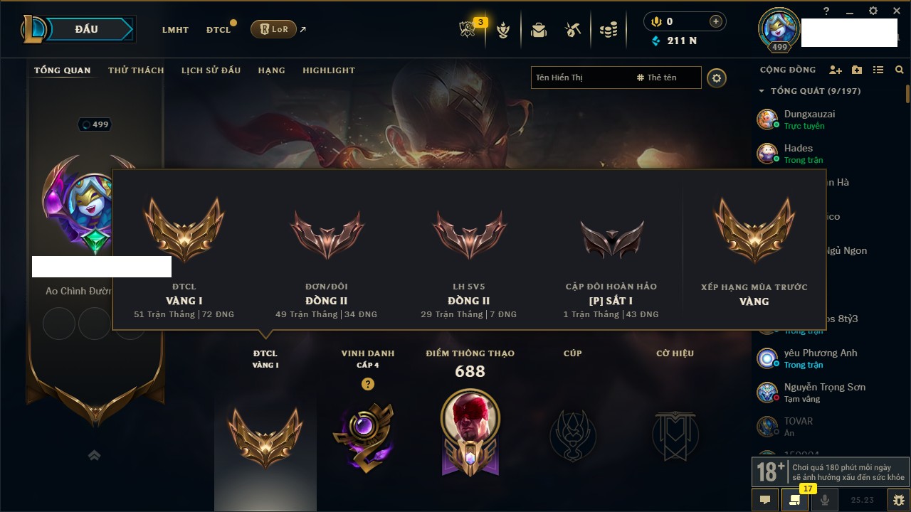 Rank Đơn: Lục Bảo IVKhung: VàngTướng: 171 - Còn 154648 THXTrang Phục: 203Rank ĐTCL: Bạch Kim IVLinh Thú: 69