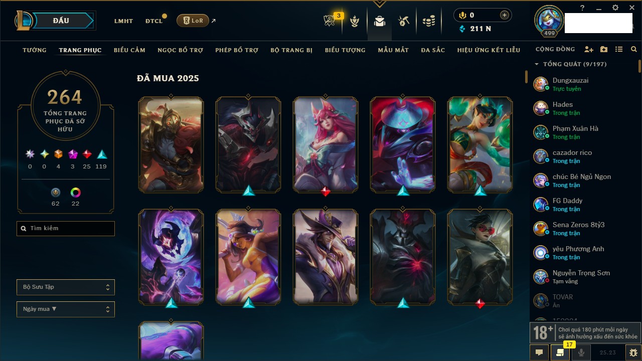 Rank Đơn: Vàng IIKhung: VàngTướng: 170 - Còn 243330 THXTrang Phục: 230Rank ĐTCL: Chưa RankLinh Thú: 68