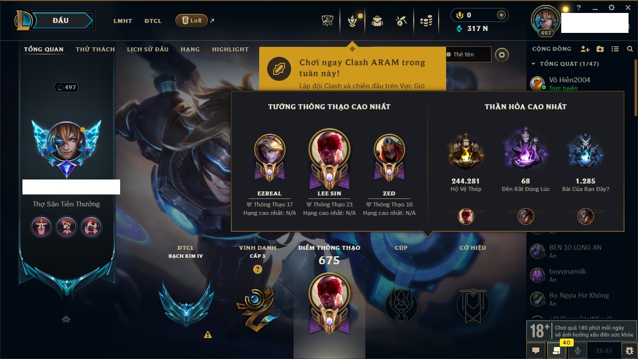 Rank Đơn: Bạc IVKhung: BạcTướng: 171 - Còn 7819 THXTrang Phục: 243Rank ĐTCL: Chưa RankLinh Thú: 102