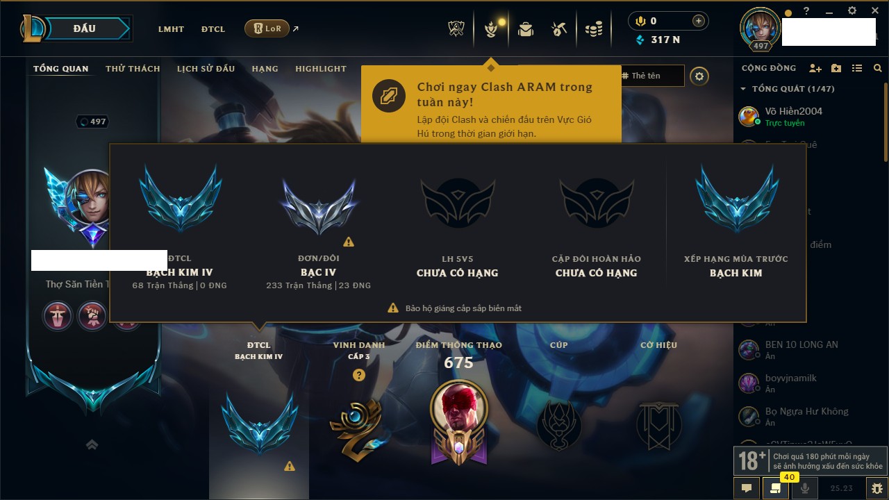 Rank Đơn: Bạc IIIKhung: Chưa có khungTướng: 171 - Còn 21493 THXTrang Phục: 252Rank ĐTCL: Bạch Kim IVLinh Thú: 123