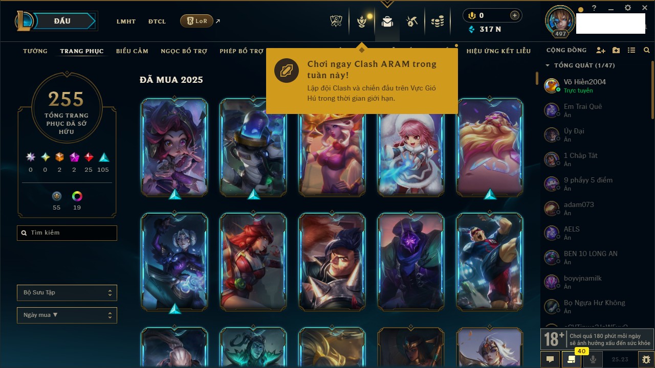 Rank Đơn: Vàng IIKhung: VàngTướng: 171 - Còn 34018 THXTrang Phục: 250Rank ĐTCL: Sắt IILinh Thú: 19