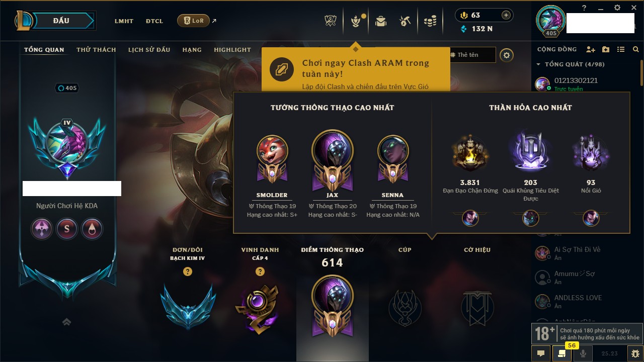 Rank Đơn: Bạch Kim IIKhung: VàngTướng: 171 - Còn 140736 THXTrang Phục: 182Rank ĐTCL: Chưa RankLinh Thú: 14