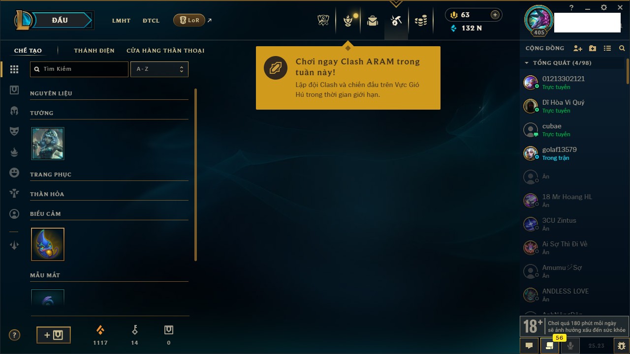 Rank Đơn: Vàng IVKhung: VàngTướng: 170 - Còn 84355 THXTrang Phục: 199Rank ĐTCL: Chưa RankLinh Thú: 116