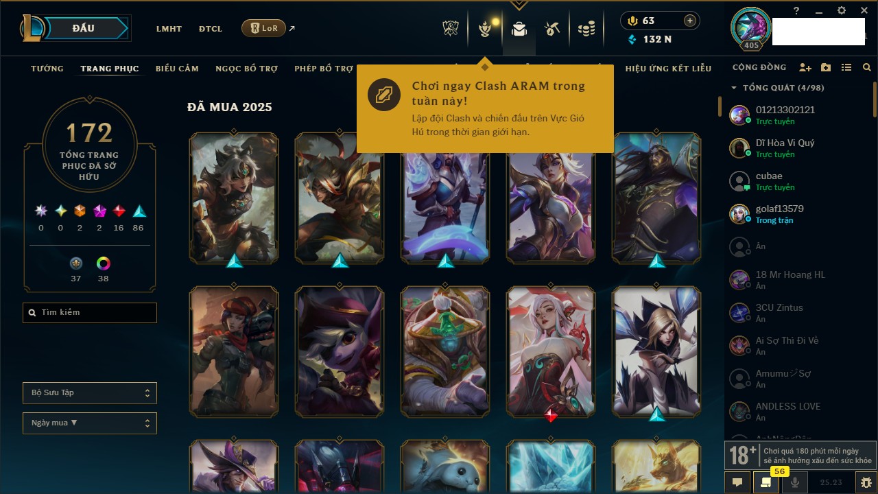 Rank Đơn: Bạc IIIKhung: BạcTướng: 171 - Còn 51045 THXTrang Phục: 220Rank ĐTCL: Sắt IILinh Thú: 141