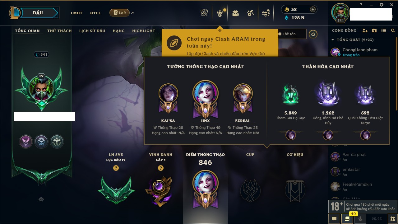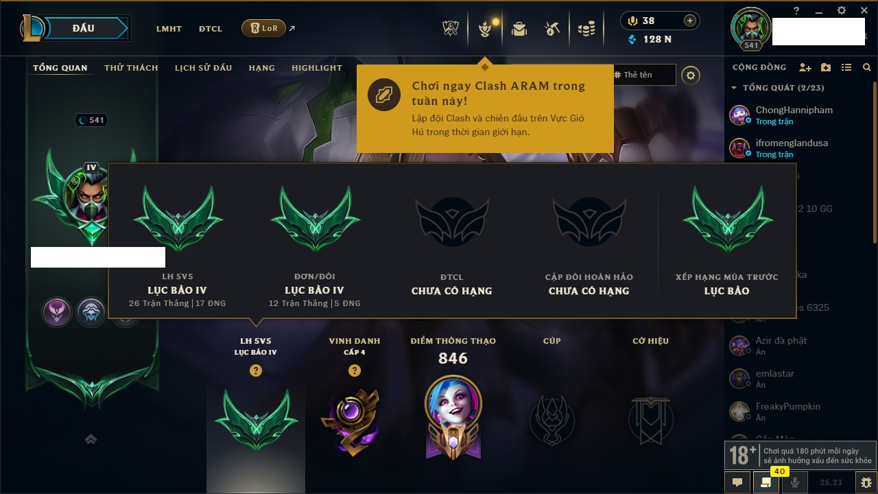 Rank Đơn: Lục Bảo IVKhung: VàngTướng: 171 - Còn 154648 THXTrang Phục: 203Rank ĐTCL: Bạch Kim IVLinh Thú: 69