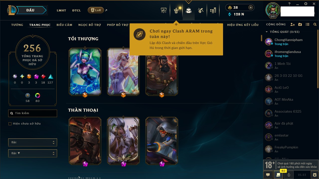 Rank Đơn: Vàng IIIKhung: VàngTướng: 172 - Còn 164704 THXTrang Phục: 255Rank ĐTCL: Kim Cương IVLinh Thú: 156